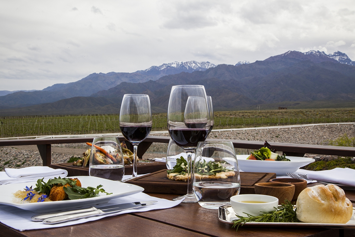 Set on a 790-acre estate in the foothills of the Andes Mountains, Casa de Uco has a sleek, minimalistic style designed to harmonize with the surrounding landscape. Common areas include an award-winning restaurant, wine bar and lounge, outdoor pool, game room, and a living room with fireplace. Terraces overlook the private vineyards, where guests can dine among the vines or participate in excursions like wine tasting, horseback riding, and carriage rides.