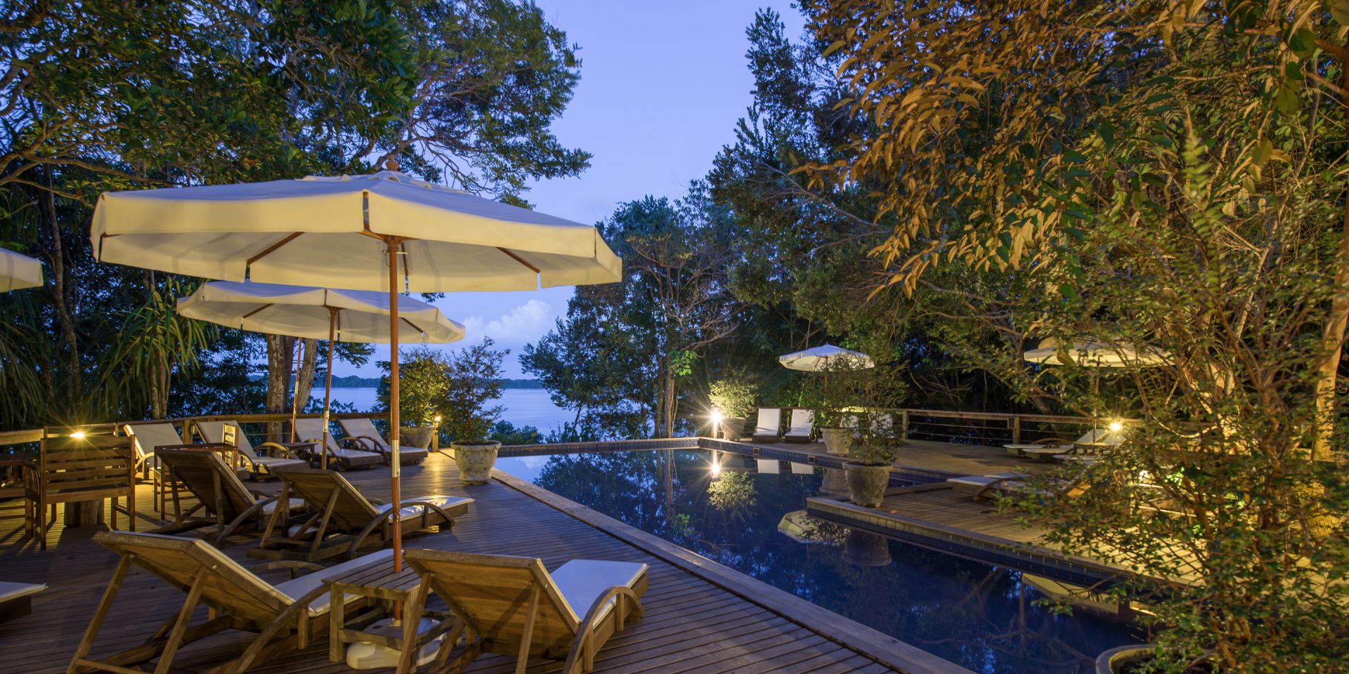 Anavilhanas Jungle Lodge sits across from Anavilhanas National Park, on the shore of the Rio Negro. Each of its 16 thatched, wooden bungalows are perched upon stilts. They have their own balconies and hammocks, with views of the jungle. Guests dine in a separate thatched lodge, where they savor local produce, including tropical fruits and fresh fish. The lodge also offers a pool and games room.