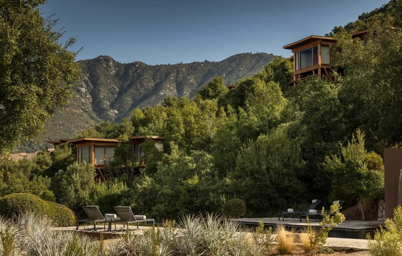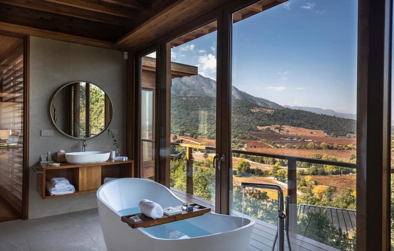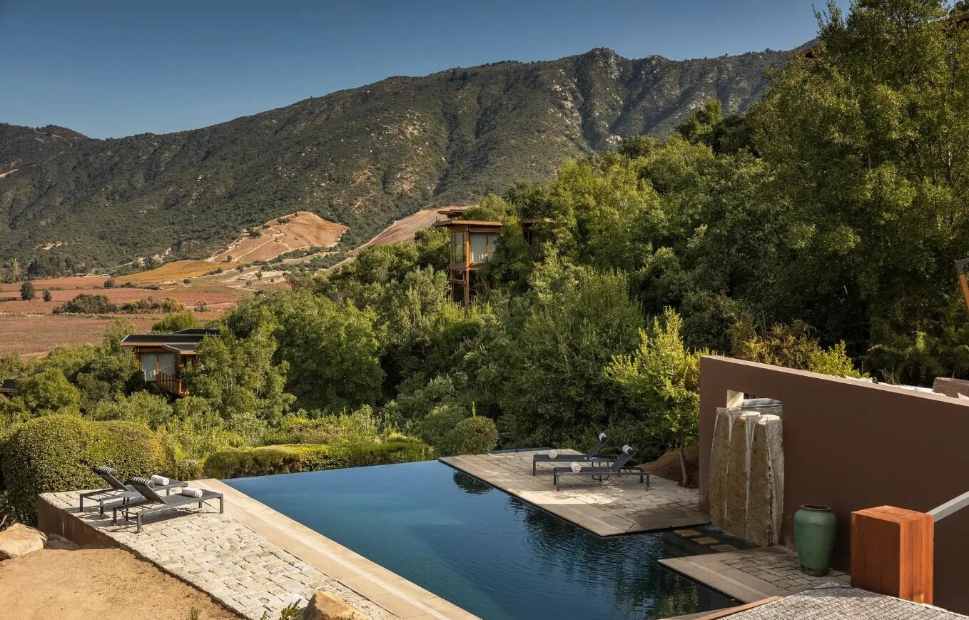 Clos Apalta Residence is an exclusive wine estate retreat set on a hillside within the Clos Apalta vineyard in Chile’s Colchagua Valley near Santa Cruz. The property consists of a small collection of private casitas and villas positioned across the slope, connected by landscaped paths overlooking the surrounding vineyards and mountains. Facilities include a restaurant focused on seasonal local cuisine, a wine cellar and tasting room highlighting the estate’s wines, a large outdoor swimming pool, and a lounge and terrace spaces oriented toward the valley views. The grounds form part of the working Clos Apalta winery, allowing guests direct access to the vineyard and cellar experiences within the estate.