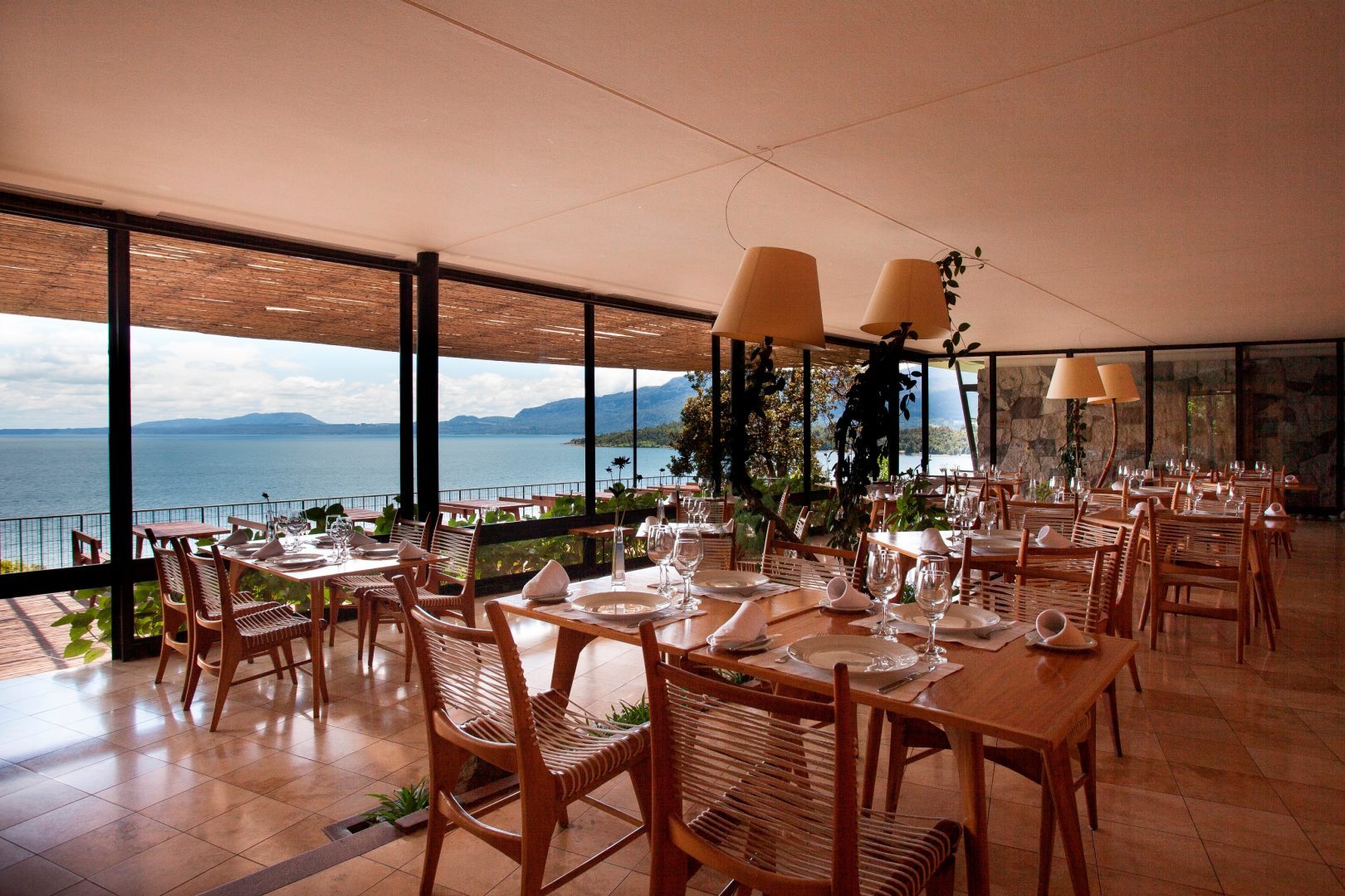 Hotel Antumalal sits on a wooded point overlooking Lake Villarica, a few kilometers outside the bustle of Pucon. Built in the modernist style of the 1950s, its furnishings blend native wood, iron, and rope, and every room features a fireplace and lake views. With a gourmet restaurant, heated pool, spa, and Jacuzzi, Hotel Antumalal is a longstanding top boutique hotel option in the Chilean Lake District.