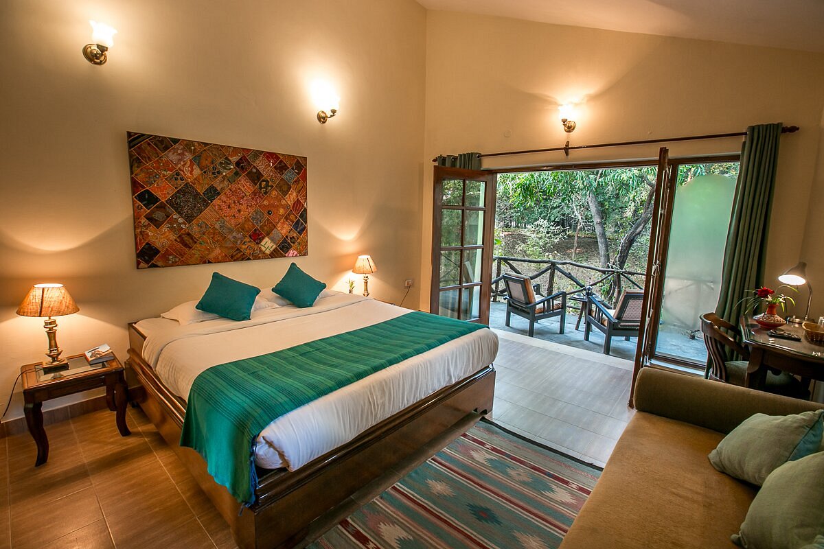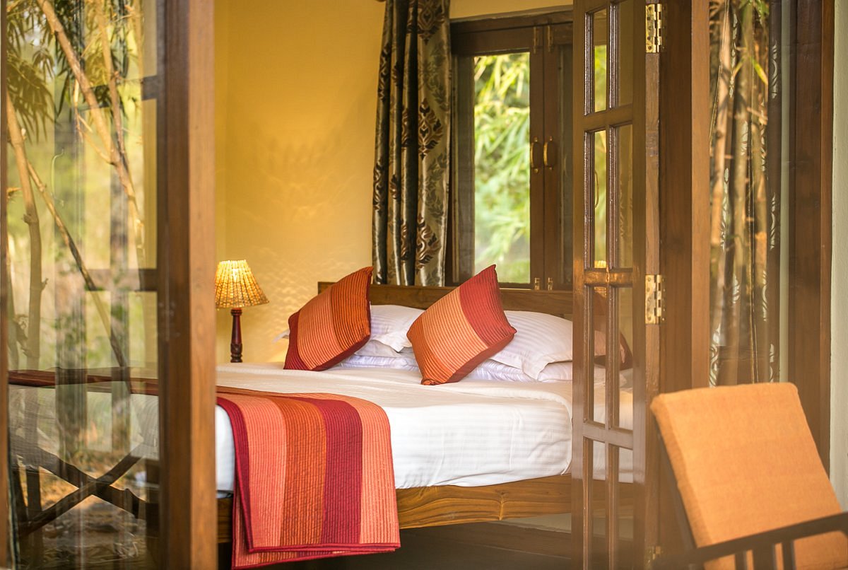 Located within walking distance of Bandhavgarh National Park’s main gate, Bandhavgarh Jungle Lodge has twelve thatched double–bedded cottages around an inner courtyard. There are two separate villas with further accommodations of eight rooms. A spacious thatched dining room serving home cooked Indian food and Continental cuisines becomes the center point of activities like campfire performances, lectures, and star gazing. The estate has meadows that attract deer and fruit trees that are home to birds and butterflies. An occasional alarm call from the jungle close by alerts you when tigers are nearby.
