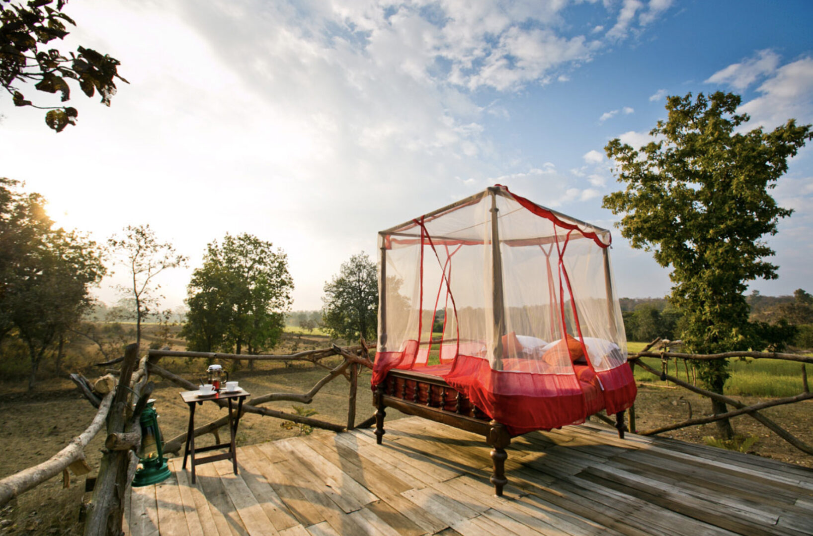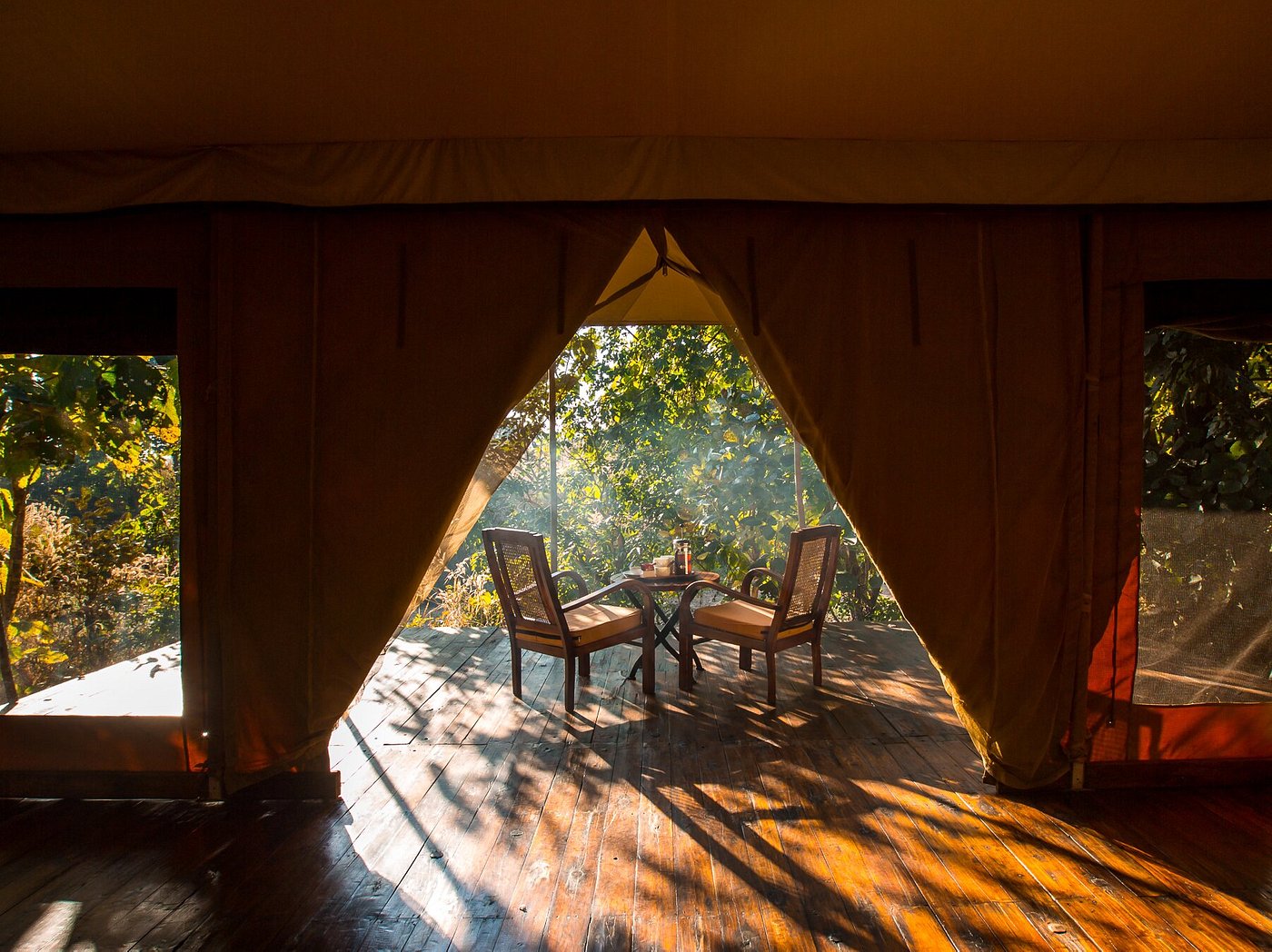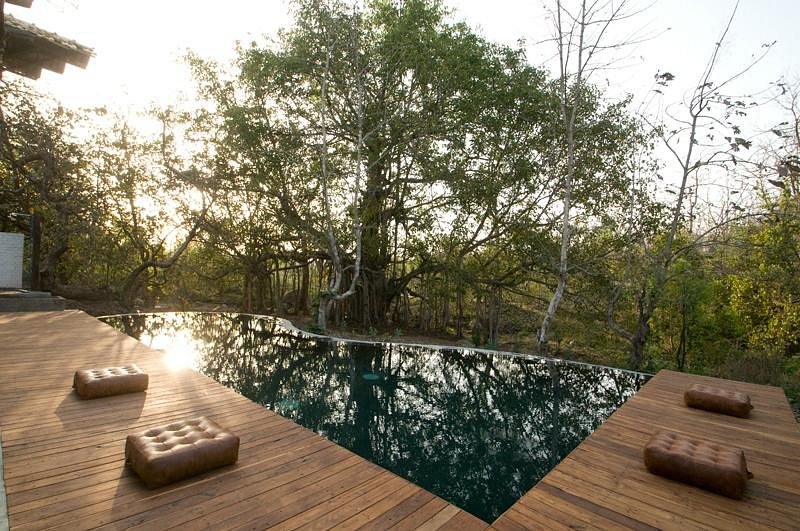 Inspired by an ancient banyan tree and built to cause the least impact to the surrounding environment, Jamtara Wilderness Camp was built to provide an unforgettable experience with sustainability as its cornerstone. Jamtara provides for the ideal atmosphere to relax, whether it's birdwatching, taking a swim in the infinity pool, or unwinding with a drink under the stars. 10 luxury tents make up the camp, each designed to allow an optimum view of nature. With the option of rolling up the front panels of the tent, the guests can lounge on the patio, which overlooks a dry river bed.