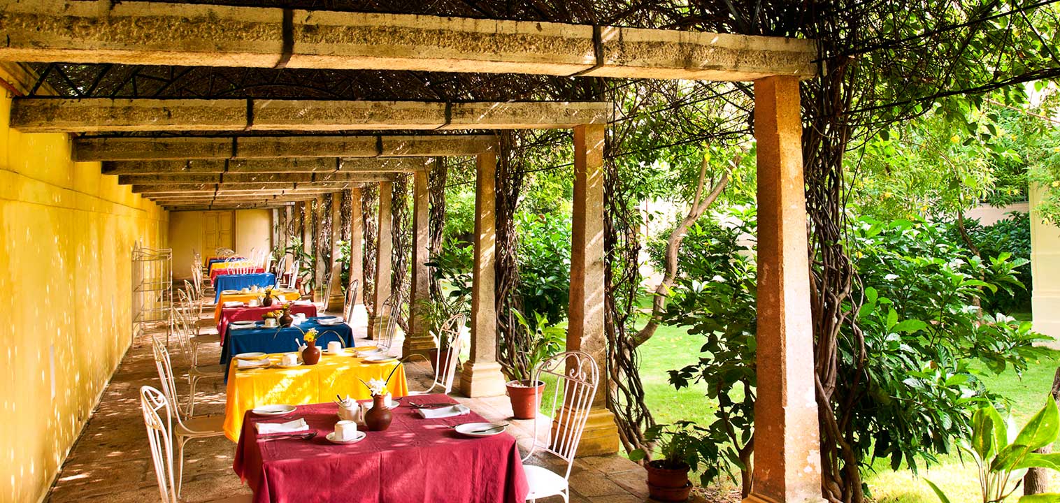 This hotel is housed in a beautiful centuries-old historical South Indian home. Much of the furniture, tiles, and woodwork are handmade and original. The gardens and pool offer a calming oasis, and the restaurant features local cuisine, which is famous for its diverse range of spices and flavors. Visalam also boasts an "interactive kitchen" where guests can observe and participate in cooking classes. The rooms are airy and spacious, and feature amenities such as air-conditioning and WiFi.