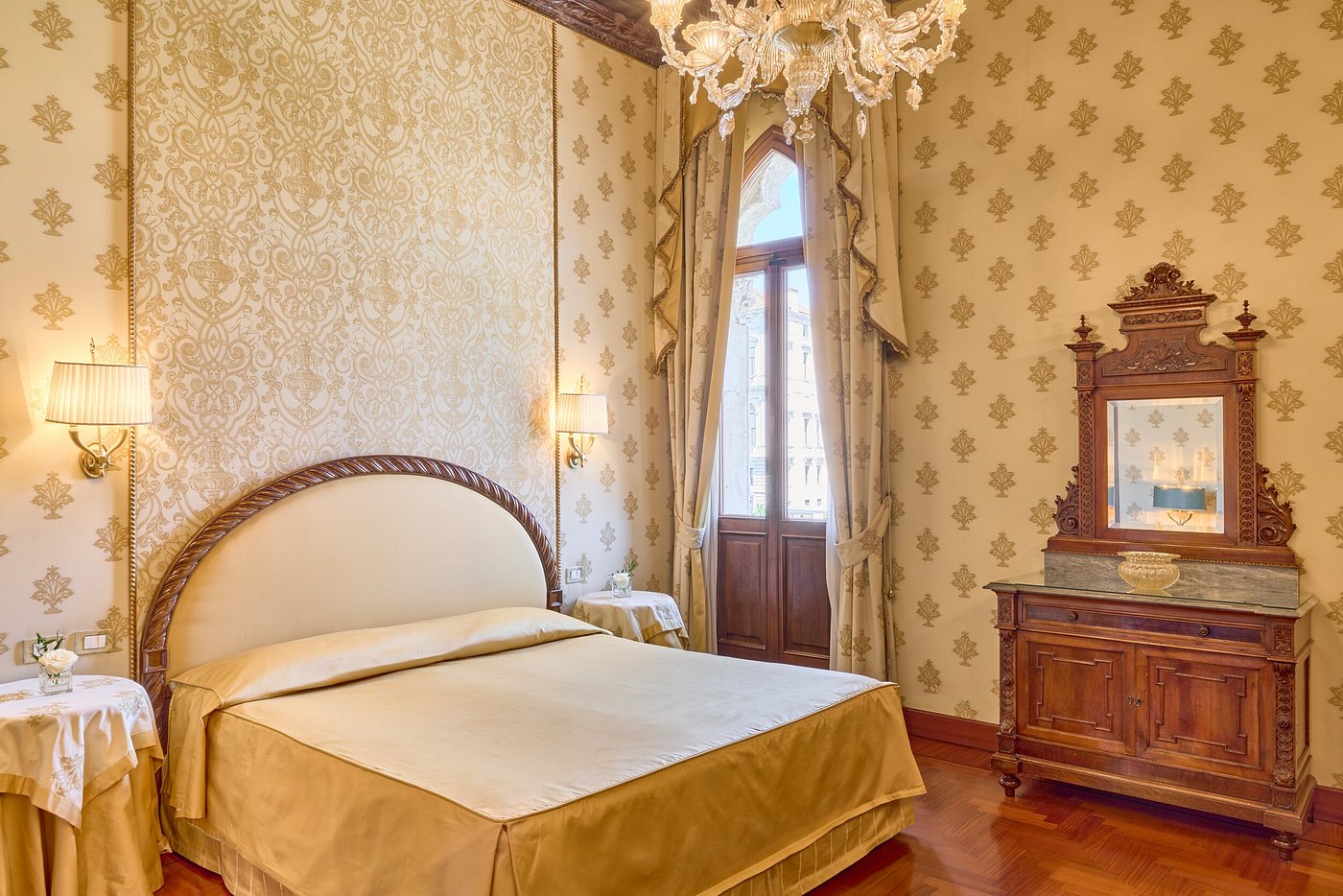 Hotel Palazzo Stern is set in a historic Moorish-style building on the Grand Canal in Venice. The building features original architectural details including Byzantine mosaics, marble columns, and antique furnishings, reflecting its past as a noble residence. The rooms are well-adorned and stately, many with views of the canal. Facilities include a restaurant overlooking the canal, a bar, and a rooftop terrace with a Jacuzzi and sweeping views of the surrounding area.