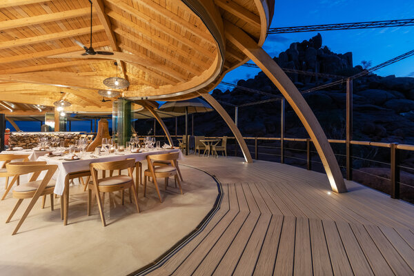 Onduli Ridge is a boutique luxury camp set amid granite boulders in the Doro !Nawas Conservancy in Namibia’s Damaraland. The lodge comprises six elevated suites, each featuring a king-size climate-controlled bed, a partially open-air bathroom with rain shower and flush toilet, and a private deck where the bed can be rolled outside for starlit sleep. Facilities include a communal lounge, library, dining room and bar, an infinity-edge swimming pool set into the rock, and a wildlife-viewing waterhole adjacent to the camp for unobstructed sightings. The setting offers sweeping views of Namibia’s highest mountain, the Brandberg, and the remote arid plains beyond the granite ridge.
