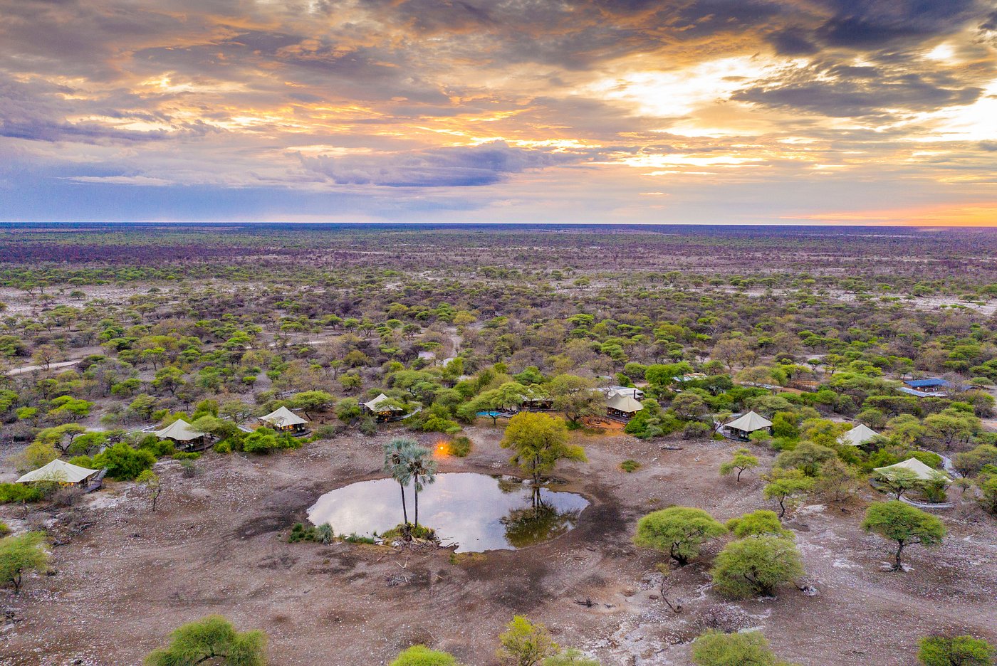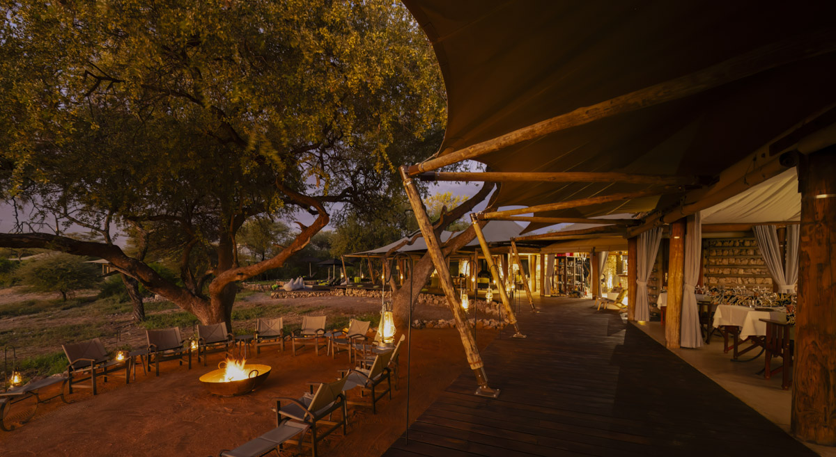 Onguma Tented Camp is a stylish, adults-only retreat set around a secluded waterhole on the private Onguma Reserve bordering Etosha National Park. The camp features seven spacious tented suites with stone floors, indoor and outdoor showers, and private decks facing the waterhole. Facilities include a lounge and dining pavilion with open views, a swimming pool surrounded by palms and acacias, and elevated walkways linking the tents. The camp’s design combines canvas, thatch, and natural textures to create a serene atmosphere focused on wildlife viewing right from the property.
