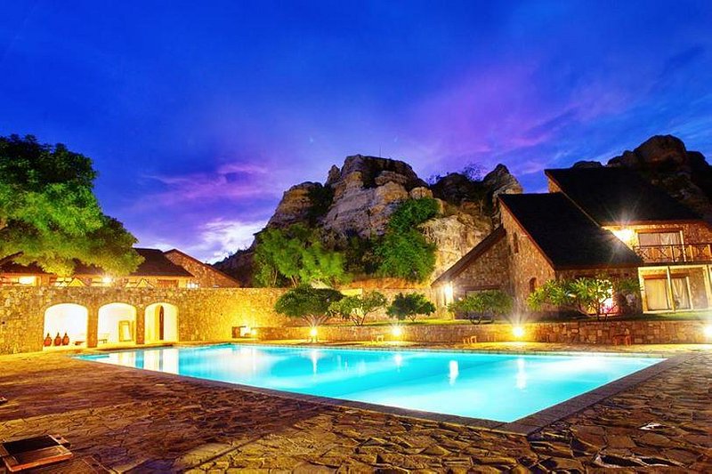 This luxury lodge is situated a half a days drive from the coast, and borders the Southern boundary of the famous Isalo National Park in southwestern Madagascar. Built of stone, this lodge perfectly blends into its surroundings, and features a large swimming pool, lush gardens and a cozy stone dining room with a large central fireplace.