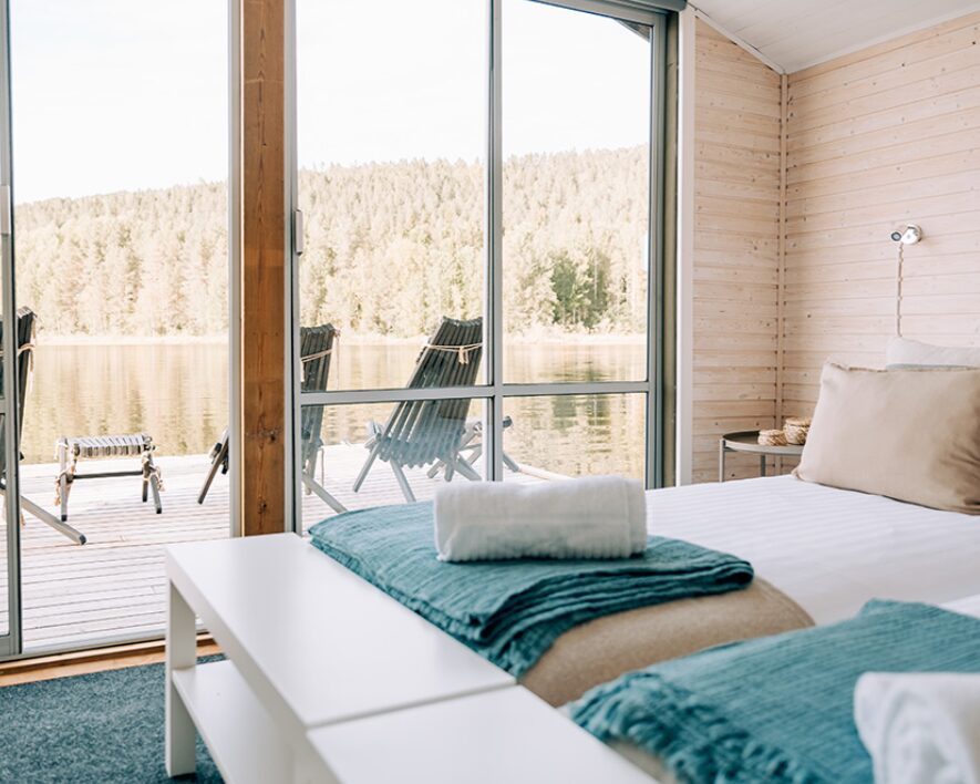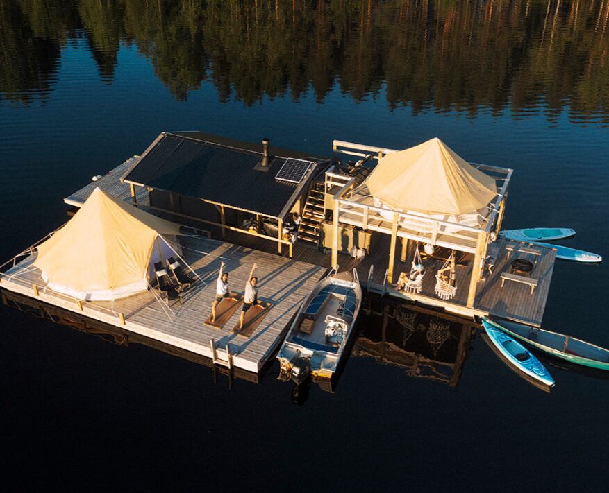 Aurora Safari Camp – The Floating Safari Camp is a unique off-grid retreat set on a lake in Swedish Lapland, accessible by boat or snowmobile depending on the season. The camp consists of floating tents built on wooden pontoons, each with cozy interiors, stoves, and panoramic windows for viewing the Northern Lights. Facilities include a floating lounge and dining platform, a sauna raft, and outdoor seating areas along the shore. Designed for minimal environmental impact, the camp combines wilderness isolation with understated Scandinavian comfort.