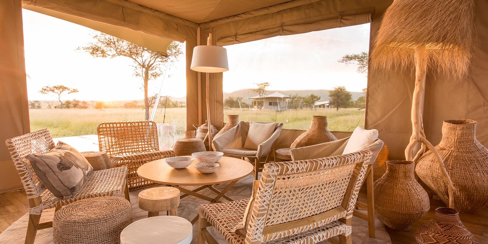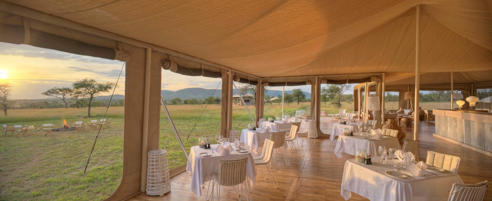 Roving Bushtops has 15 luxury tented suites overlooking the Serengeti. The tents, or “rovers,” are open on two sides to offer a panoramic view, and feature large wooden decks with sun loungers, dining table, and a sunken bathtub. The camp offers an open-sided restaurant and bar, as well as poolside and in-room dining, a swimming pool, and spa. Excursions are guided by expert trackers from the local Kuria tribe.