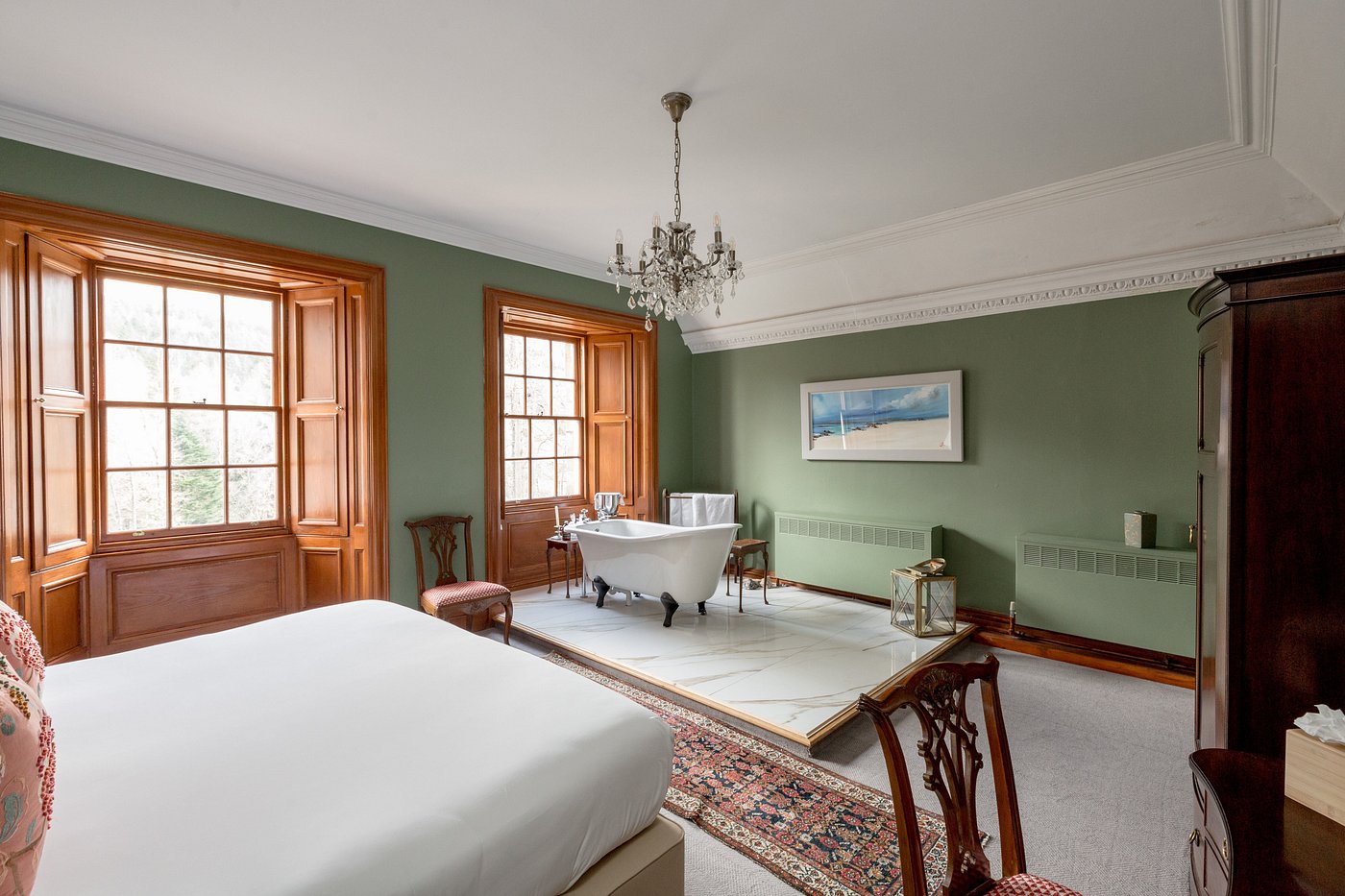 Glencoe House is an elegant Victorian mansion set within private gardens overlooking Loch Leven and the dramatic Glencoe mountains. The property features grand suites with period furnishings, fireplaces, and spacious lounges, some with private terraces and hot tubs. Facilities include in-suite fine dining with multi-course meals served in each guest’s private dining room, as well as a bar and landscaped grounds. Once the former home of Lord Strathcona, the house offers an intimate experience that combines Highland grandeur with modern comfort.