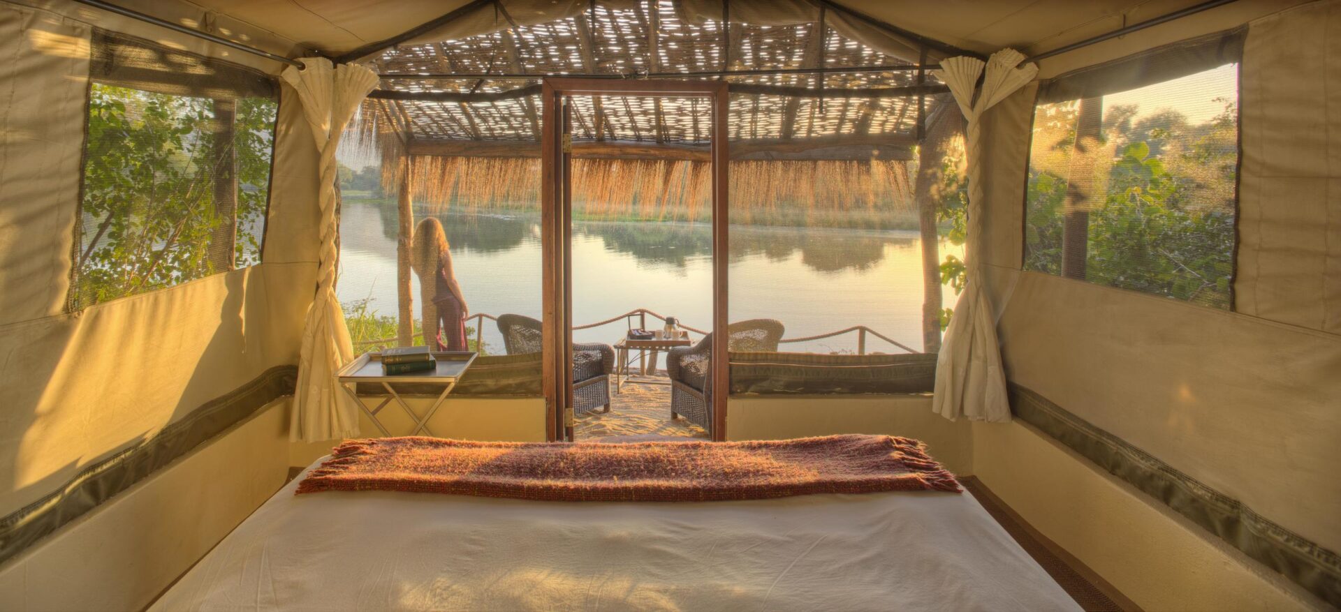 Set on the edge of a mighty river in the shadow of a mountain escarpment, you'll feel right at home under a shady grove of tress at Chongwe River Camp. Wake up from a peaceful nap to the sound of an elephant rubbing against the side of your tent as it lumbers past. Dotted along the riverbank, Time + Tide Chongwe River Camp is set at the confluence of the Chongwe and Zambezi Rivers which wind through the forested valley, creating a haven for wildlife like lions, leopards and wild dog.