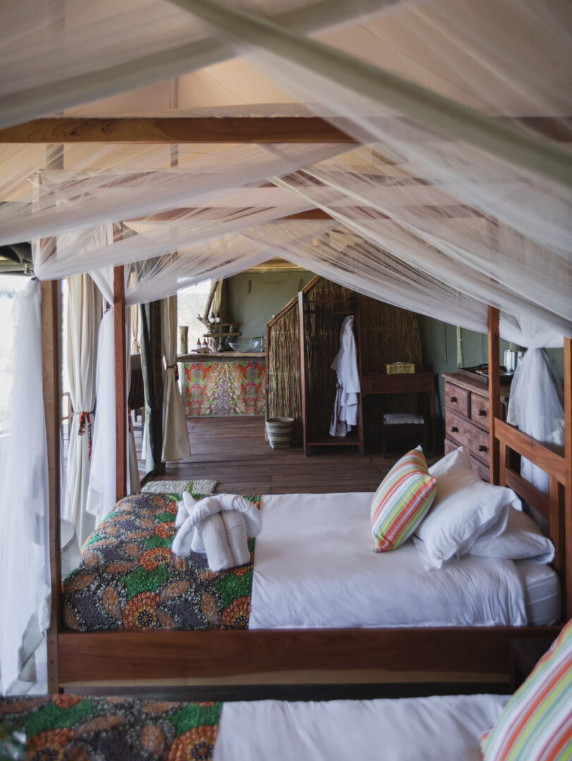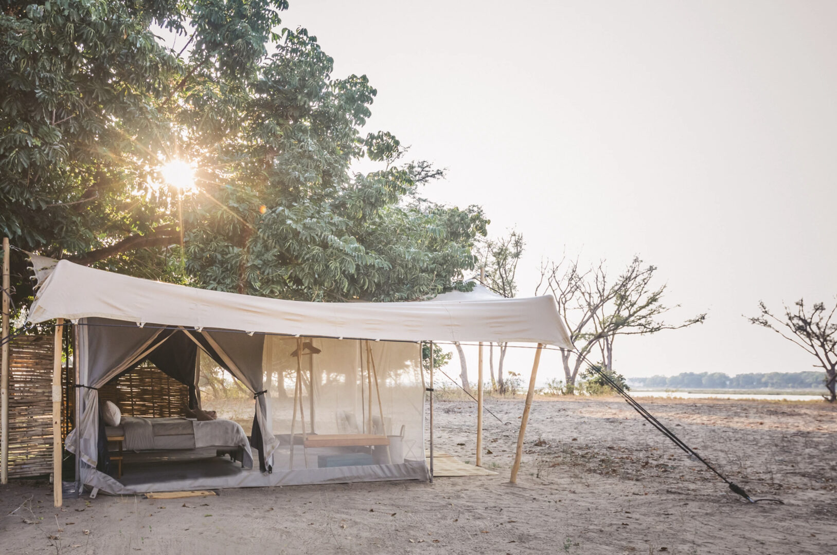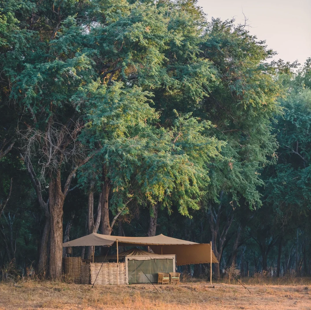 Kutali is a comfortable tented camp with all the luxuries one could wish for, but with the charm and ethos of a true seasonal bush-camp. There are just 5 guest tents, and the camp caters for no more than 10 people at once. Each tent is carefully and expertly located for the best possible views across the Zambezi River. The Kutali tents are bespoke and very comfortable, with high quality linen and mattresses, alongside flushing toilets, running water taps and traditional bucket-showers. A main area stretch-canvas tent set beneath the towering Winterthorn trees makes for an exceptional location for meals, reading, charging cameras, and wildlife watching.