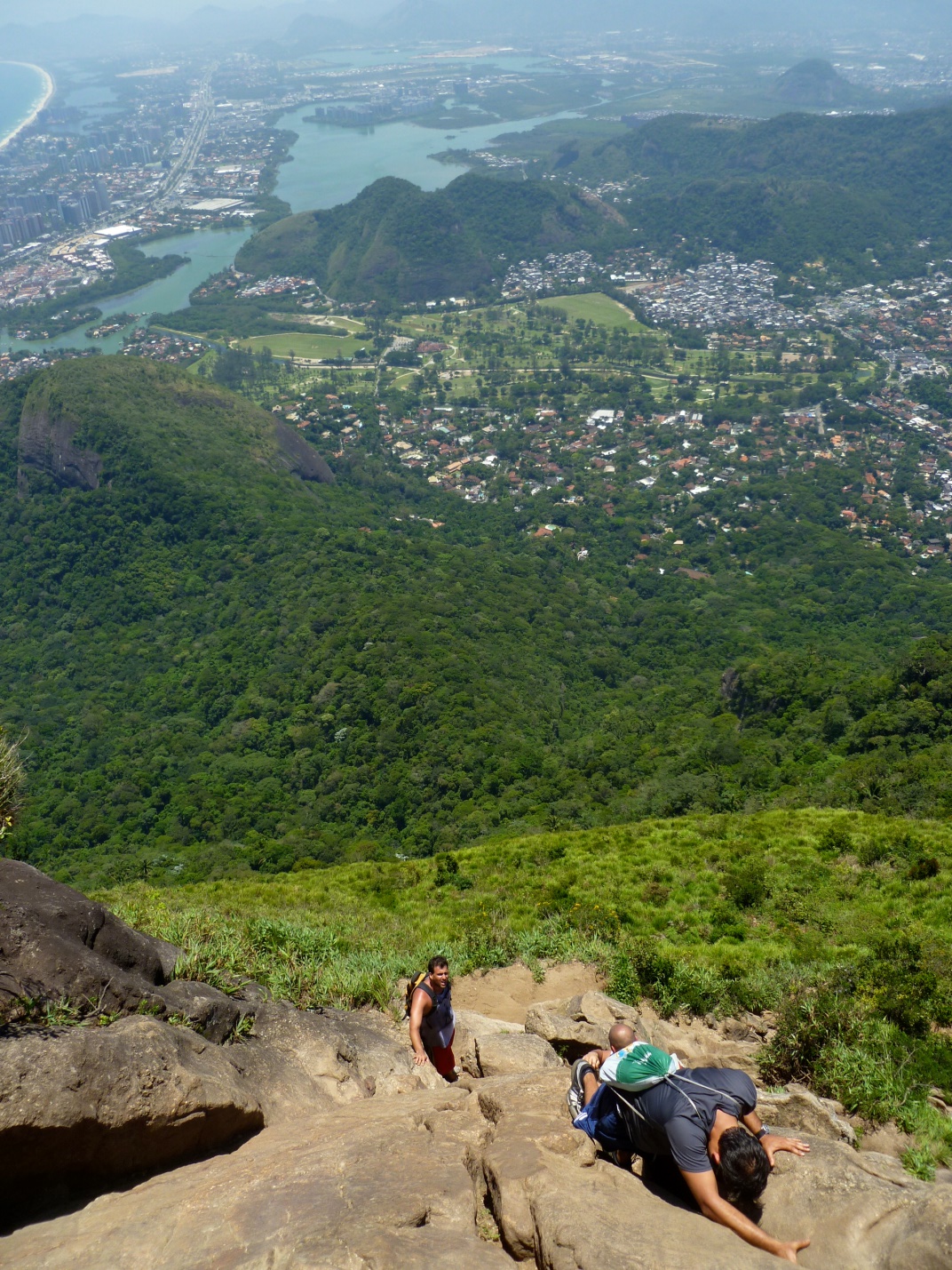 The rock climbing section is short but difficult. When I hiked Pedra de Gavea recently, my guide helped me choose my foot- and hand-holds. We had to find cracks in the rock to wedge our feet and small, natural shelves where we could place our hands and pull ourselves up. It is more common to complete this section with ropes, but it is still a trail best suited to people in good shape and with no fear of heights.