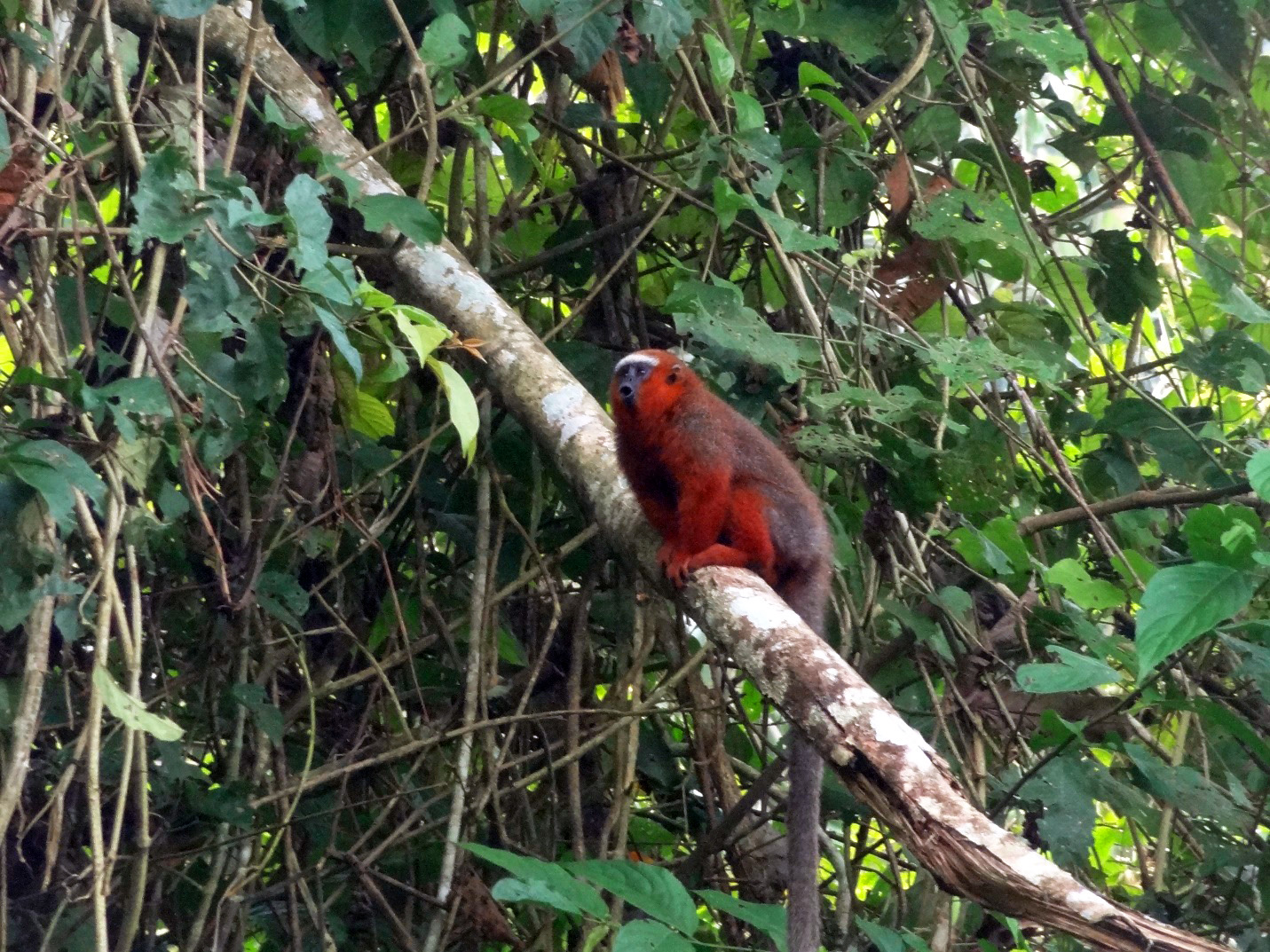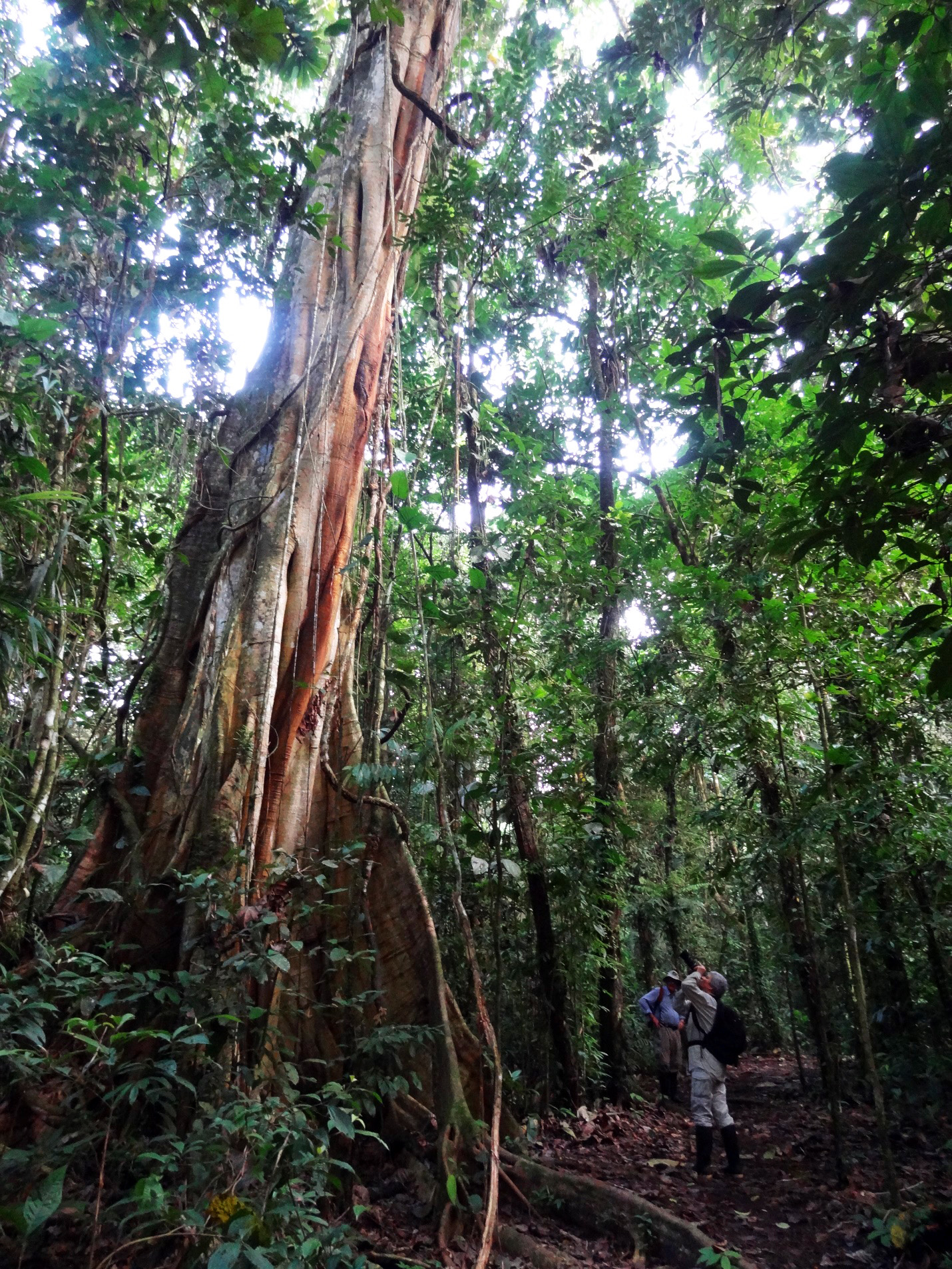Heeding Sergio’s call to retreat, the two paddlers steered us away from the caiman and toward the jungle shore, but the caiman changed its course and swam straight at us. The paddler in the rear of the canoe, Javier, theorized that his bright orange shirt was luring the giant reptile in our direction, so he quickly tore his shirt off and threw it down on the canoe floor.