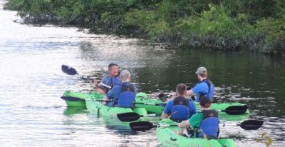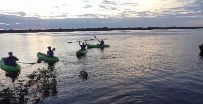 While I honed in on a Ferruginous Pygmy Owl, following the naturalist guide’s lead and coaxing the diurnal owl to swoop down near my kayak by imitating its call with short whistling sounds, my brother Mark, who joined me on the Tucano cruise, paddled his kayak around a treetop and discovered a family of squirrel monkeys gathered overhead. We observed the primates from our kayaks for a while, then, thinking our early morning wildlife experience was complete, began to paddle back to the Tucano – only to be joined by a pair of Grey River Dolphins, who graciously escorted us back to our ship for breakfast.