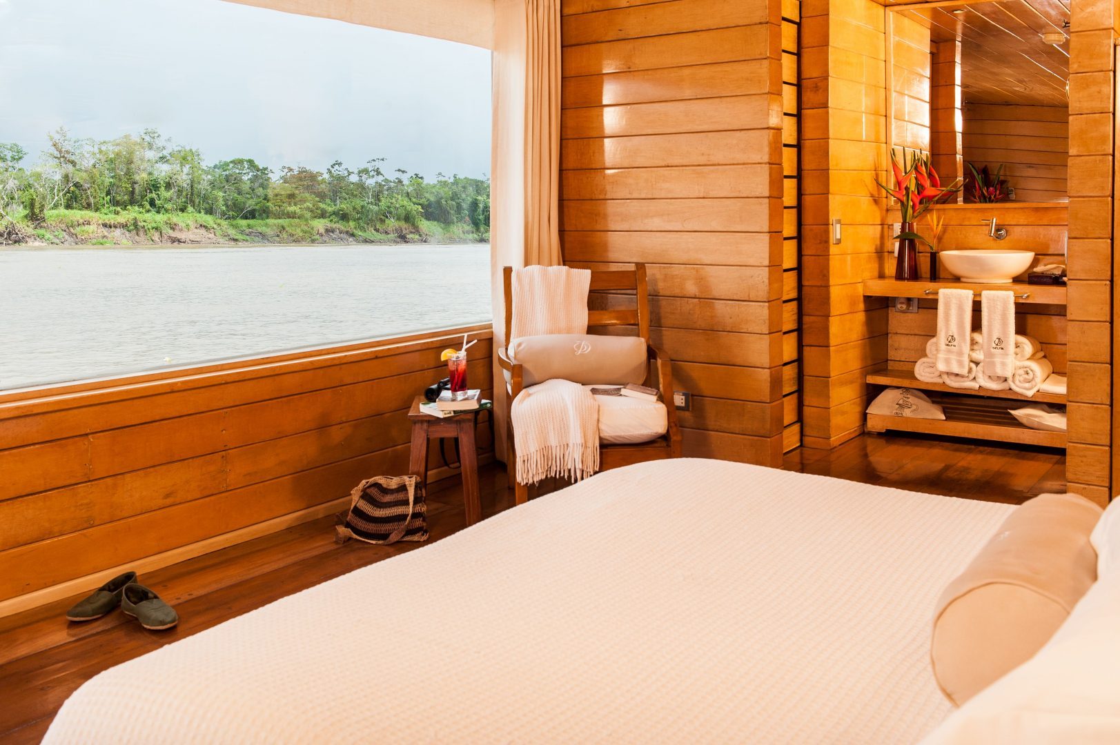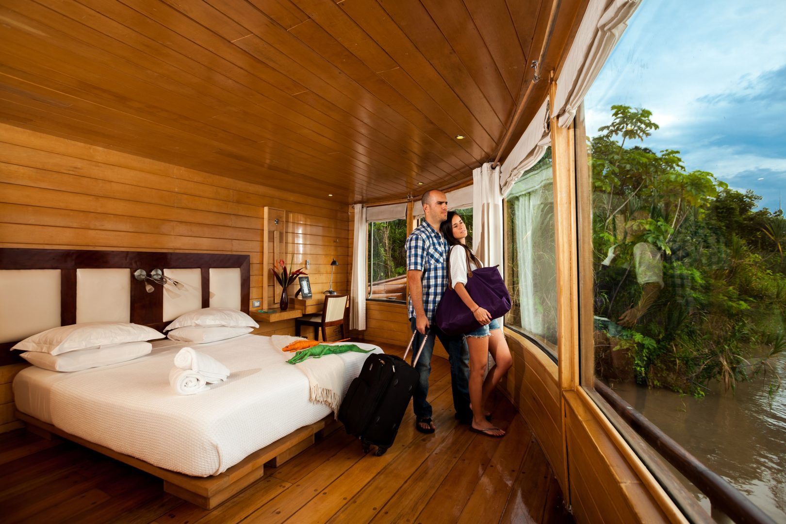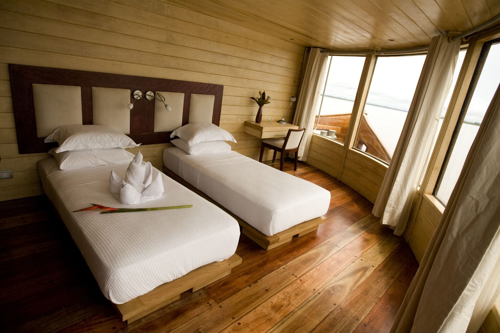4 Master Suites at the front of the boat, 180-degree panoramic windows 10 Suites on the main and upper deck All suites have private bathrooms and air conditioning. All suites are equipped with one king bed or two twin beds.