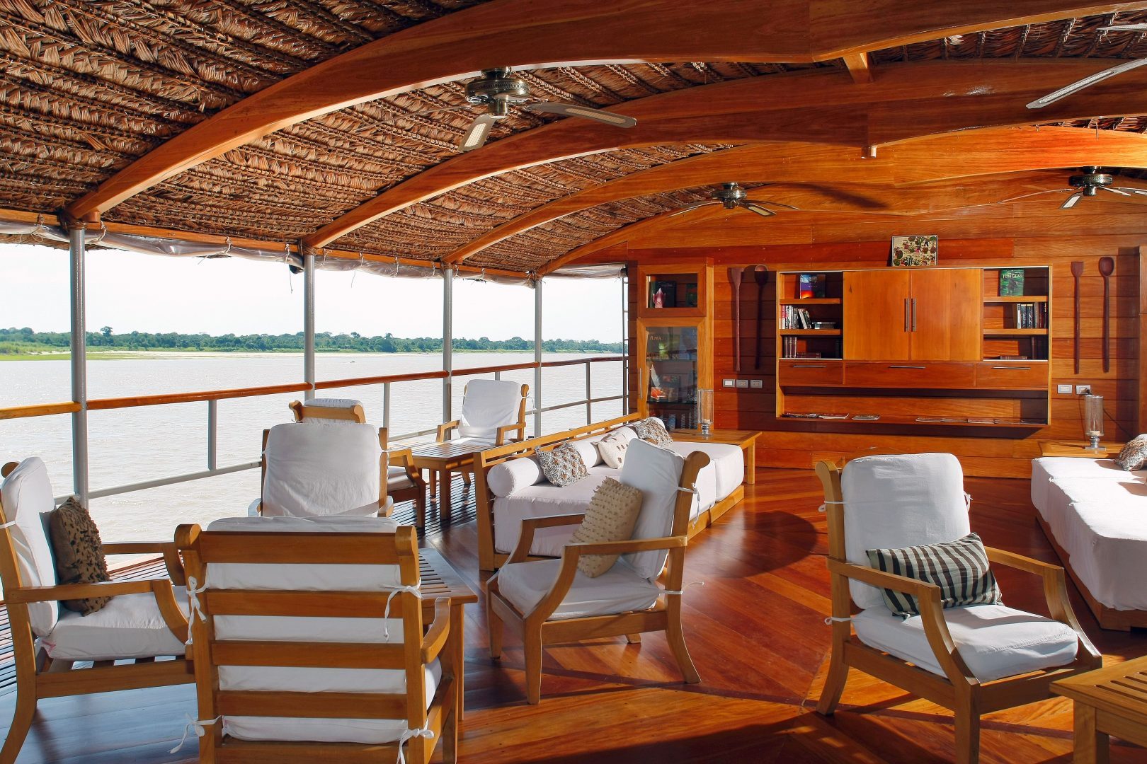 Year Built: 2009 Type of vessel: River vessel Port of Embarkation: City of Nauta Vessel´s Registry: Peru Length: 135 feet Beam: 32 feet Draft: 8´25” Capacity: 30 passengers Generator: 2 Caterpillars, 55KW each (encapsulated) Engine: Caterpillar C12 385HP eco-electronic Cruising Speed: Average 8.2 knots Water: Water treatment plant with 7.0 cubic meter capacity Sewage Waters: Sewage treatment plant Radio Communication: VHF, UHF and satellite phone on board Launch Boats: 3 aluminum 10 passenger skiffs (+1 for emergencies with four stroke low emission Mercury 15HP engine) equipped with four stroke low emission Mercury 60HP engines + radio communications with main vessel, life jackets and flares Life Jackets: one per passenger, available in each Suite