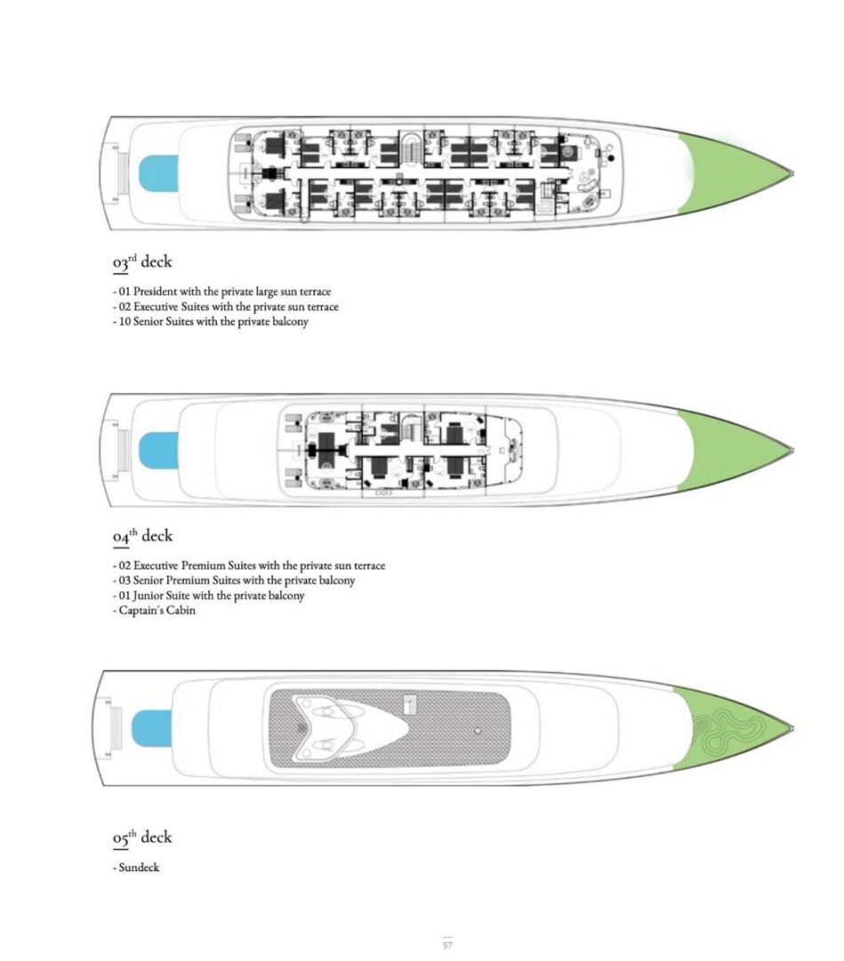 Launch: 2022 Ports of Embarkation: Halong – Lan Ha bay Length: 85m Beam: 14.2m AC: Central air-conditioning throughout Internet: Complimentary Capacity: 99 passengers