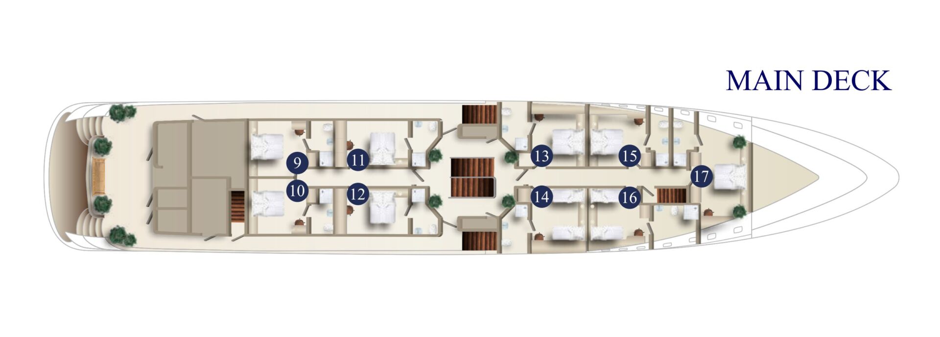 Main deck cabins: 14-15 sqm, regular windows, and ensuite bathroom.