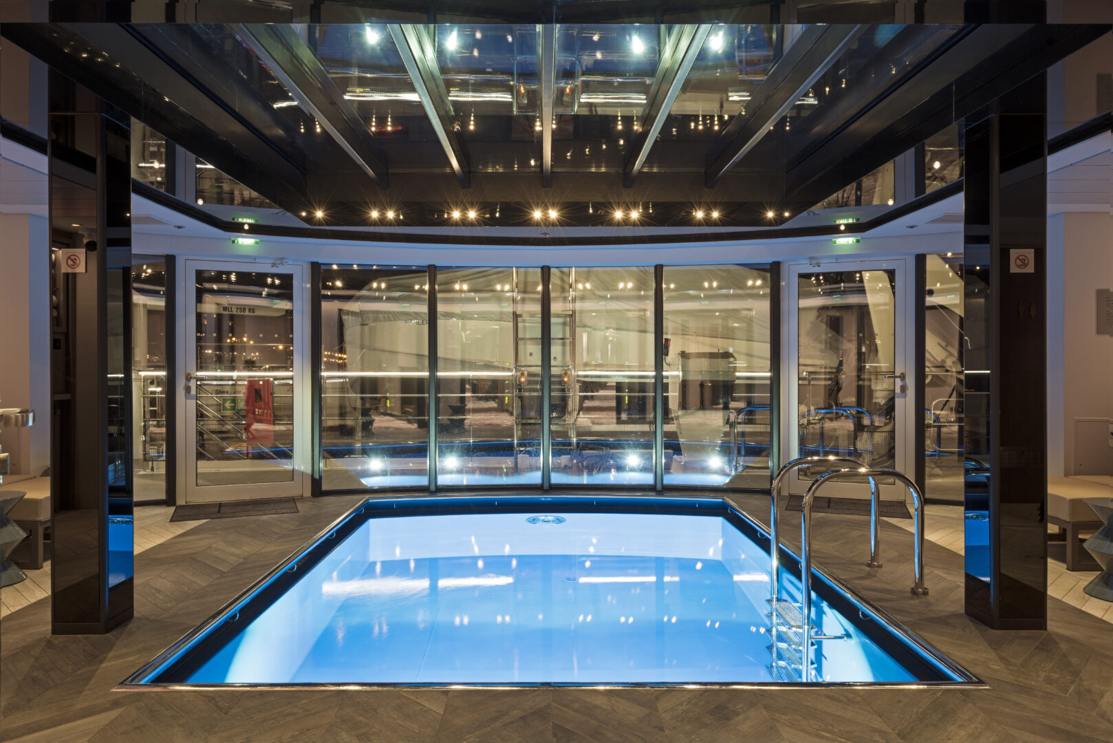 Length: 443 sq. ft. Width: 36 sq. ft. Passenger Capacity: 110 Crew: 55 Total suites: 55