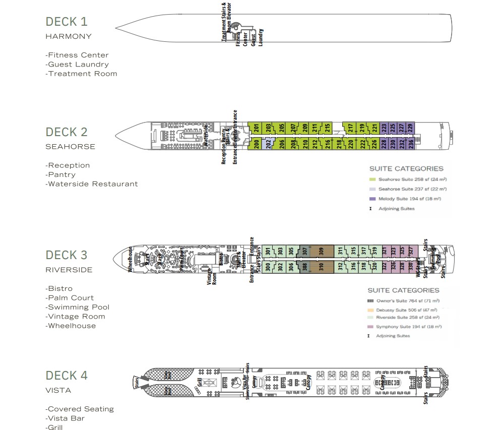 2 Owner’s Suites – 764 sq. ft. – Two bedrooms with a king bed in each room, or convertible to two twins 2 Ravel Suites – 506 sq. ft. – King bed or two twins 16 Riverside Suites – 258 sq. ft. – King bed or two twins 21 Seahorse Suites – 258 sq. ft. – King bed or two twins 8 Symphony Suites – 194 sq. ft. – King bed or two twins 8 Melody Suites – 194 sq. f.t – King bed or two twins