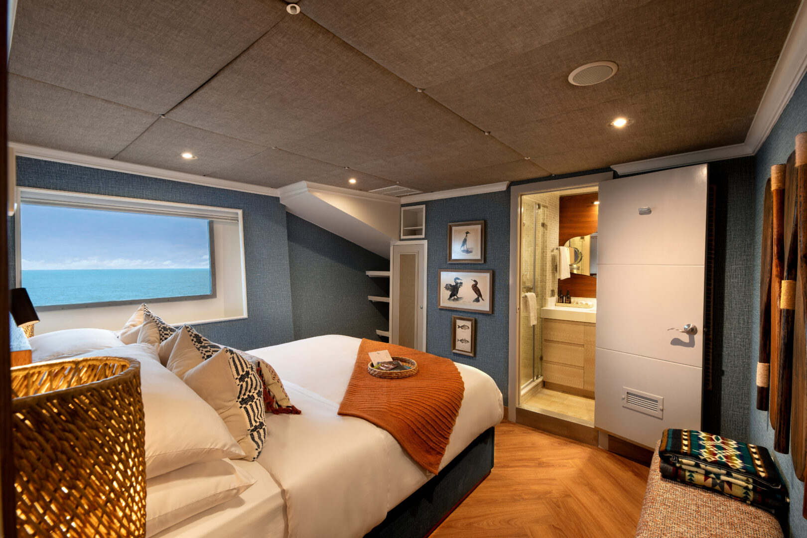 The Galapagos Explorer is a luxury 38 m (124 ft) expedition yacht. With only 12 guests on board, the Galapagos Explorer offers one of the best guest-to-staff ratios in the islands. Panoramic floor-to-ceiling windows fill the spacious guest areas with natural light, providing breathtaking views of the ever-changing landscapes of the Galapagos. The yacht’s al fresco sundeck on the uppermost deck features a hot tub and a comfortable lounge area. The ship features four cabins and two suites distributed between the lower, middle and upper decks. All cabins feature ensuite bathrooms and air conditioning.