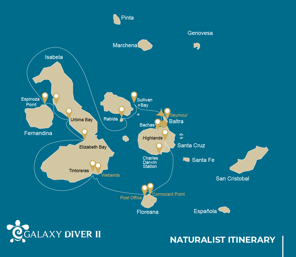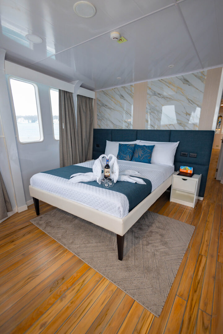The Galaxy Diver II is a small expedition yacht operating in the Galápagos Islands, designed to accommodate both scuba divers and naturalist travelers on separate itineraries. The vessel offers eight air-conditioned cabins with private bathrooms, an indoor dining room, lounge, and an outdoor area, including a sun deck with seating. On dive departures, the boat is equipped with a dedicated dive deck, gear storage, compressors, and tenders for daily dive operations, while naturalist itineraries focus on shore landings and wildlife viewing led by certified guides. The Galaxy Diver II emphasizes functional comfort and flexibility, allowing guests to choose between an active diving-focused voyage or a classic Galápagos exploration without diving facilities dominating the onboard experience. Note that for diving itineraries, you have to be a certified advanced diver with at least 50 recorded dives, including deep, current, and night dives. Prepare to have your logbook documenting your dives with you.