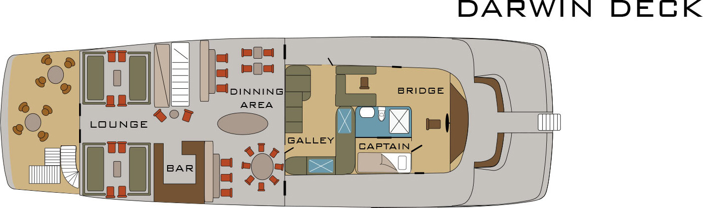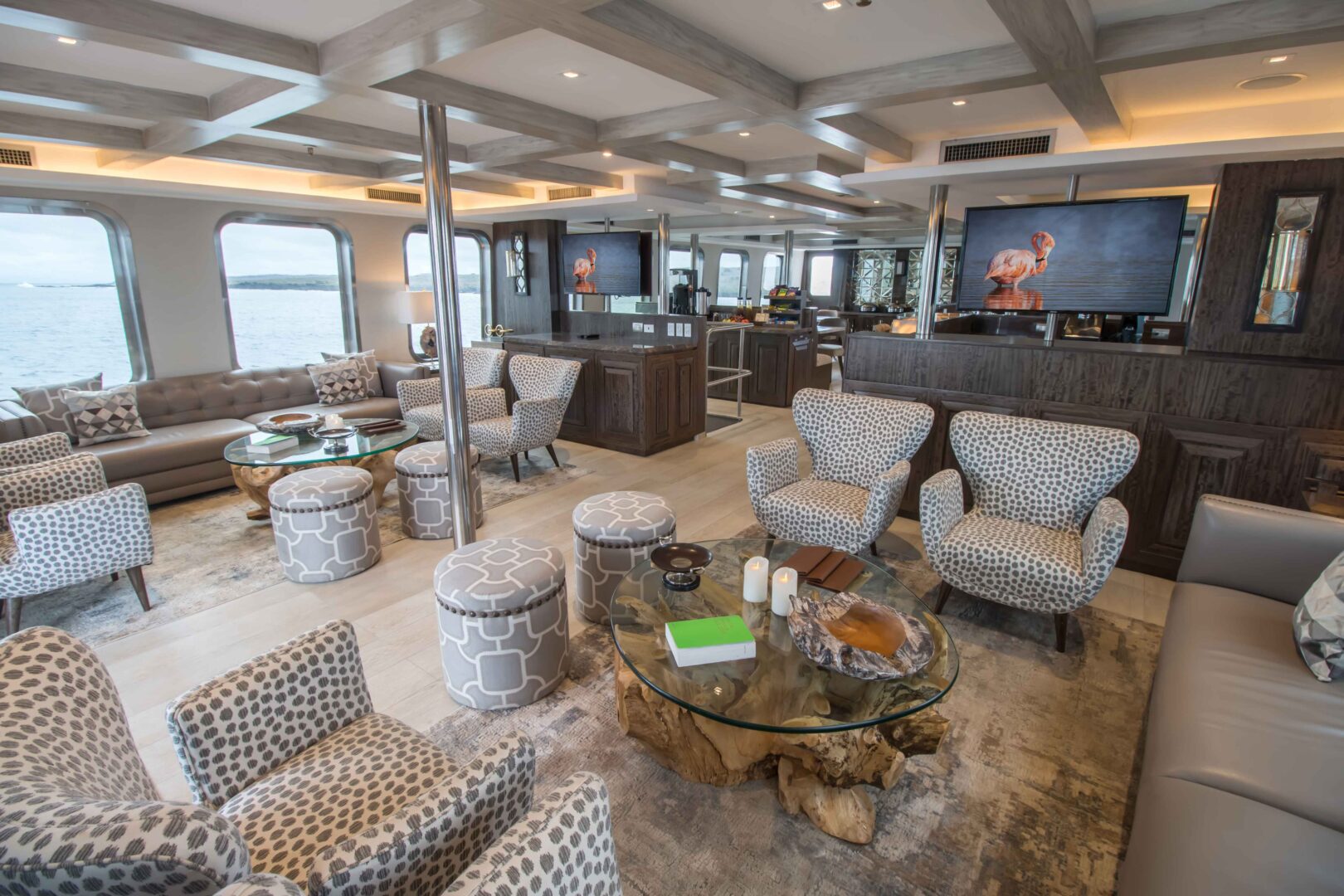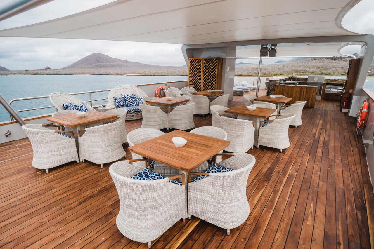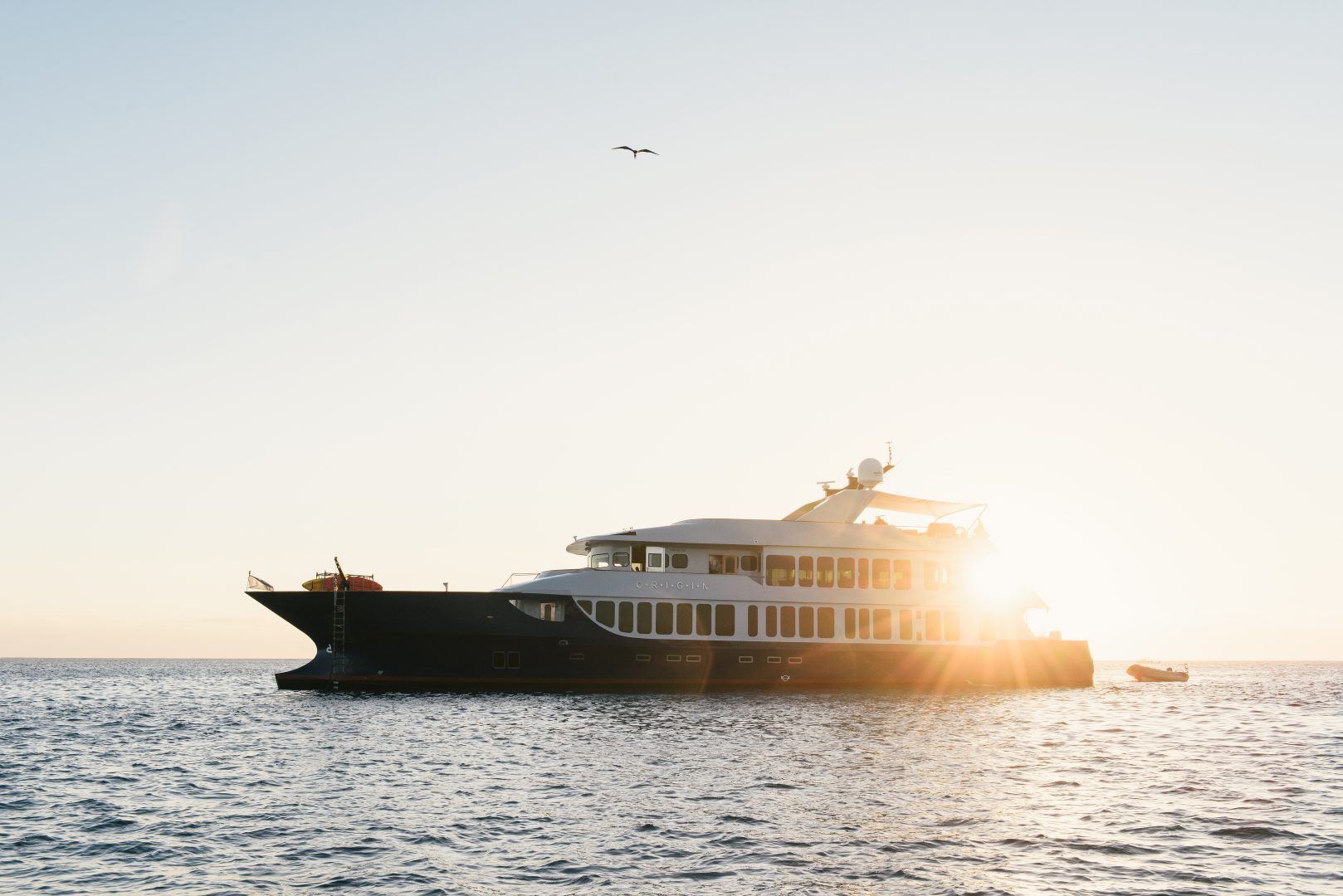 Three of the newer boats in the islands, the Origin, Theory, and Evolve are sister ships designed for a luxurious boutique experience. These 20-passenger Relais & Chateaux ships have 10 cabins with panoramic windows and feature spacious social areas, sun decks and jacuzzis, space for al fresco dining, a fitness center, spa, and a glass-bottom boat. Meals are planned and prepared by trained chefs, there is an onboard concierge for assistance, and the boats have an open bar policy. With two naturalist guides, Origin/Theory/Evolve offer some of the best guide-to-guest ratios in the islands. Excursions include snorkeling, hiking, kayaking, stand-up paddle boarding, and panga rides.