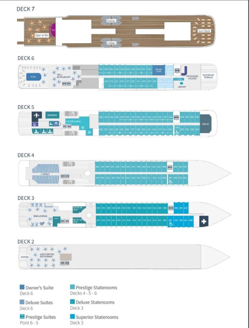 This superb mega-yacht (sister ship to the L'Austral, Le Lyrial, & Le Soleal), with 132 staterooms, was designed in France and built in Italy. 95% of the staterooms and suites have a private balcony and life aboard is relaxed and refined. The ship captures the best of the French art of living, giving passengers the unique experience of feeling one is aboard a private yacht. The most luxurious option available for polar exploration.