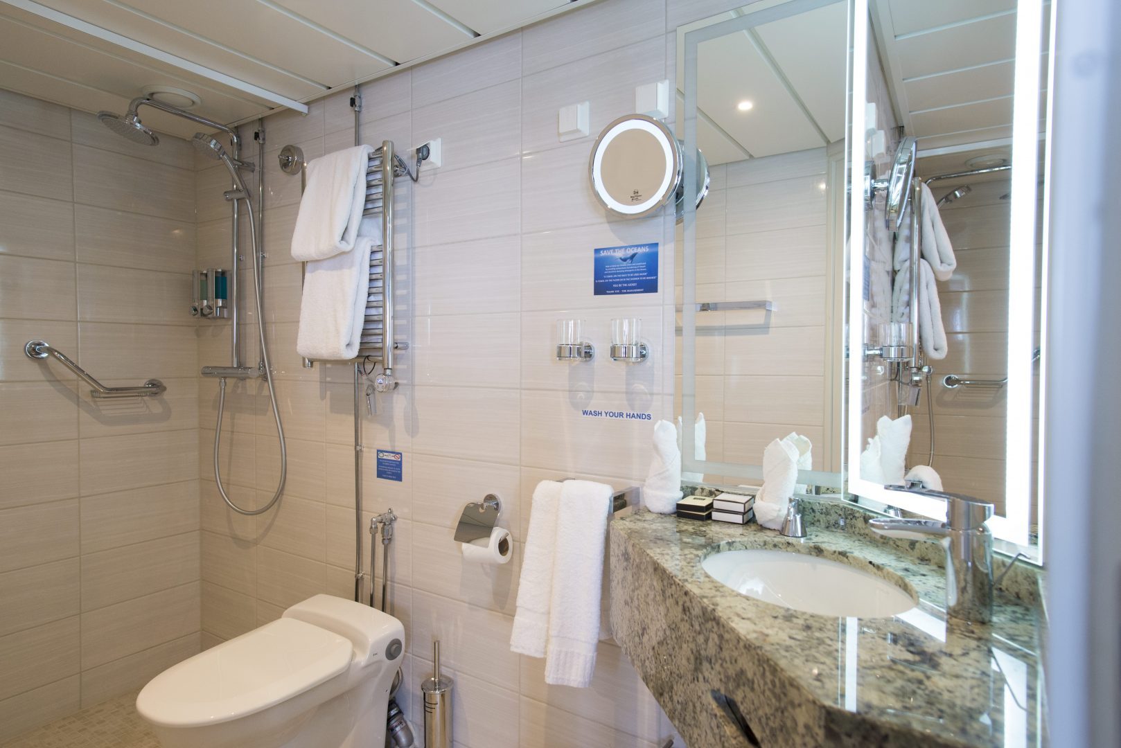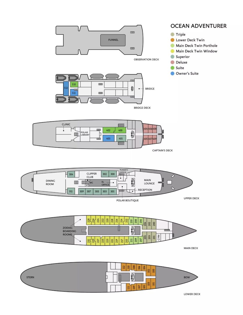 Owner’s Suite: Averaging approximately 244 sq. ft. (22 sq. m), an Owner’s Suite Cabin is equipped with one double bed made up of two twin berths. Located on the Bridge Deck, it has private facilities and windows with exterior views.