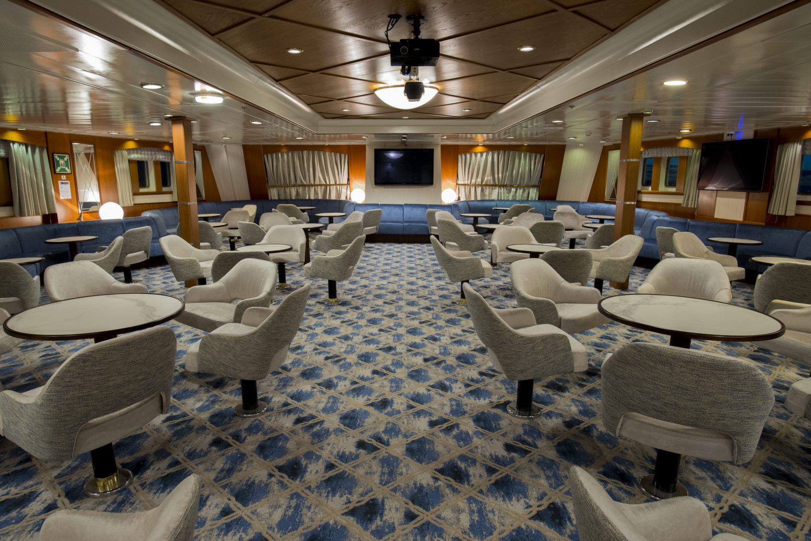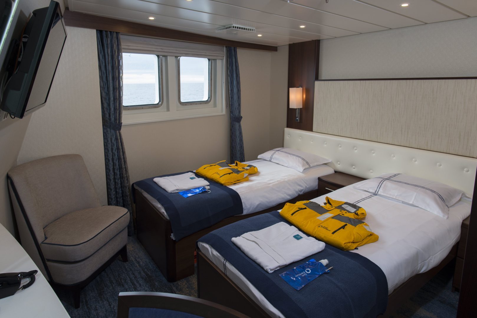 Main Deck Twin Porthole: Averaging 118 sq. ft. (11 sq. m), a Main Deck Twin Porthole Cabin is equipped with two lower berths. Located on the Main Deck, it has private facilities and a porthole with exterior views.