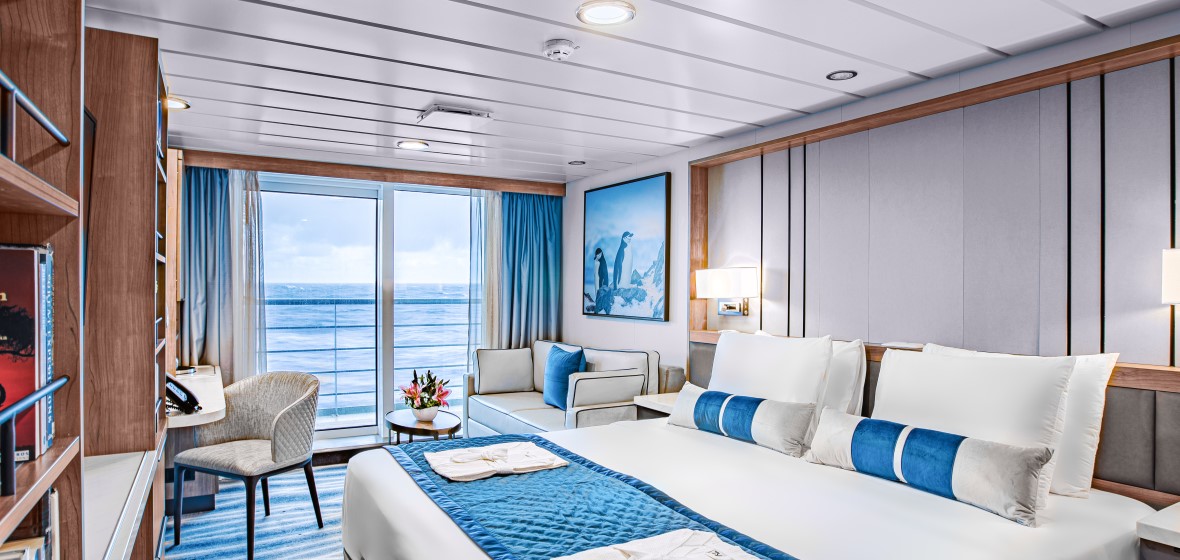 Junior Suite: Category A (452 sq. ft.) – The 4 junior suites aboard Ocean Victory have a great view from their location high up on the ship on deck 7. The suites feature a double bed or twin beds, sofa bed, seating area, a spacious bathroom and private observation deck. The cabin can accommodate up to 3 people. Located on the Amundsen deck 7.
