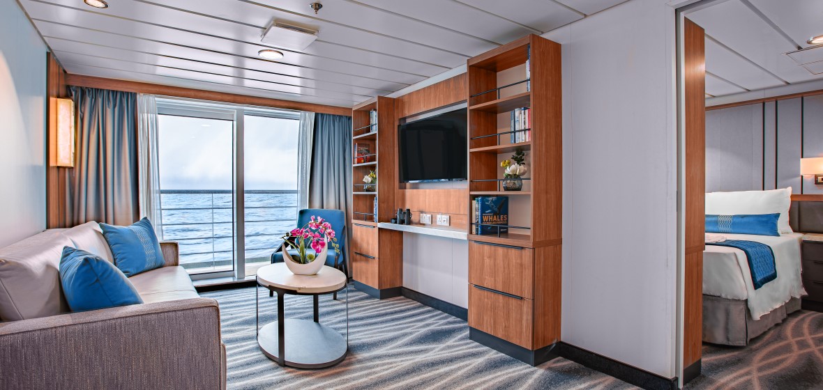 Balcony Suite: Category B (377 sq. ft.) – Ocean Victory has six Balcony Suites on board located on the Bering & James Cook deck respectively, located on deck 4 & 6. The suites feature double or twin beds and a seating area, bathroom and an extra-large private observation deck. The balcony suites can host 2 people.