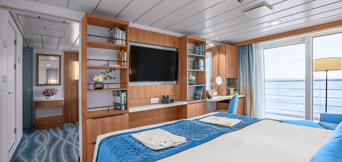 French Balcony Cabin: Category E (173 sq. ft.) – The French Balcony Suite is a standard cabin with a French balcony, a double bed, floor-to-ceiling windows and a bathroom. All French Balcony Suites are located on Deck 7.