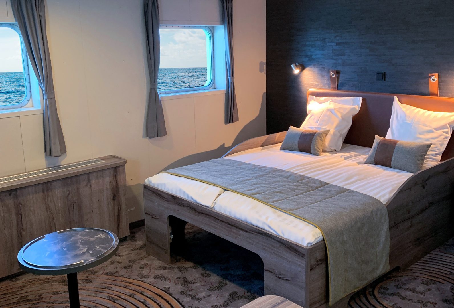 M/v “Plancius” accommodates 116 passengers in 53 passenger cabins, each with a private toilet and shower. This includes 4 quadruple porthole cabins, 2 triple porthole cabins, 9 twin porthole cabins, 26 twin cabins with a window, and 2 twin deluxe cabins (ca. 12.5 square meters) and 10 twin superior cabins (ca. 21 square meters). All cabins offer lower berths (one queen-size bed in the superior cabins and two single beds in the twin cabins) except the 4 quadruple cabins which accommodate 4 people in 2 upper and 2 lower beds, and 2 triple cabins which are set up with 1 bunk bed and 1 lower bed.