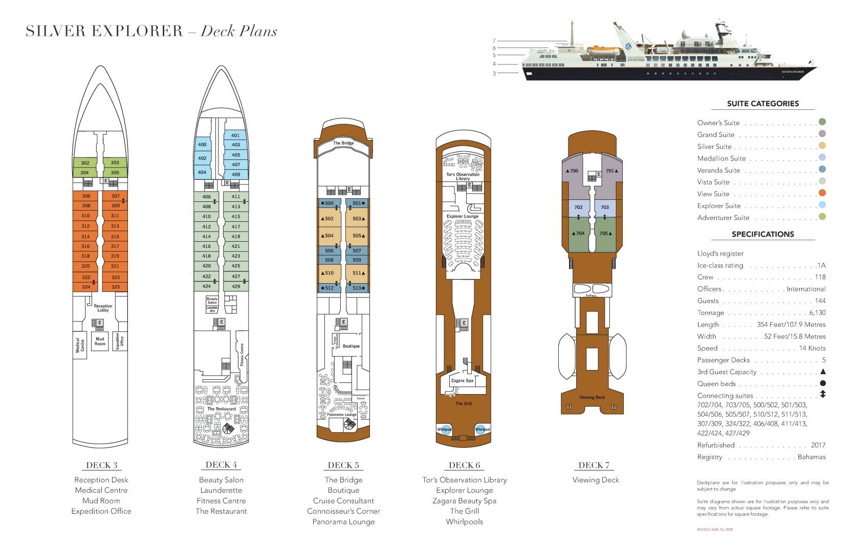 Staff & Crew: 118 Guests: 144 Length: 354 ft. Draft: 14.4 ft. Tonnage: 6072 Speed: 14 knots Class: Lloyd's 1A Refurbished: 2017