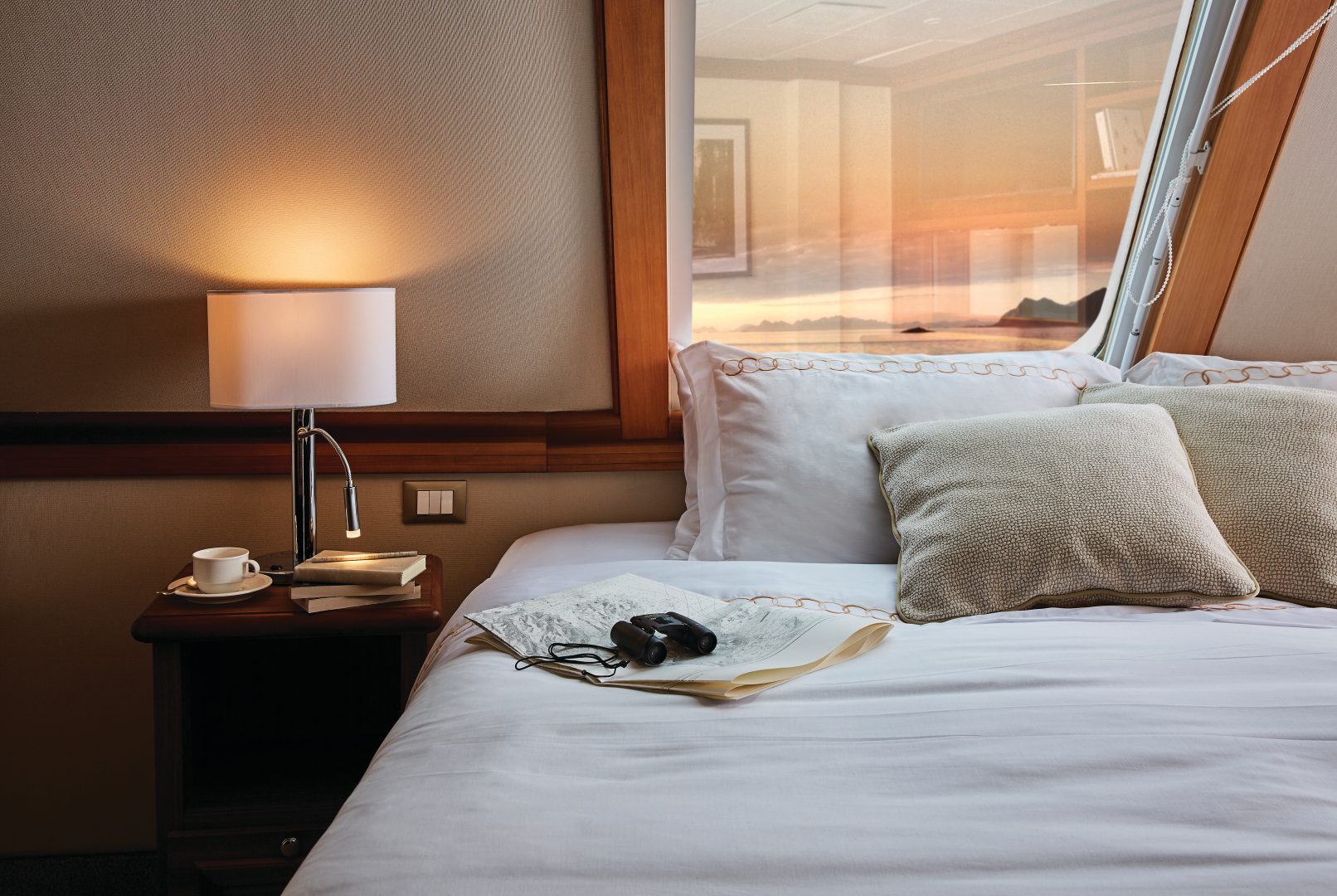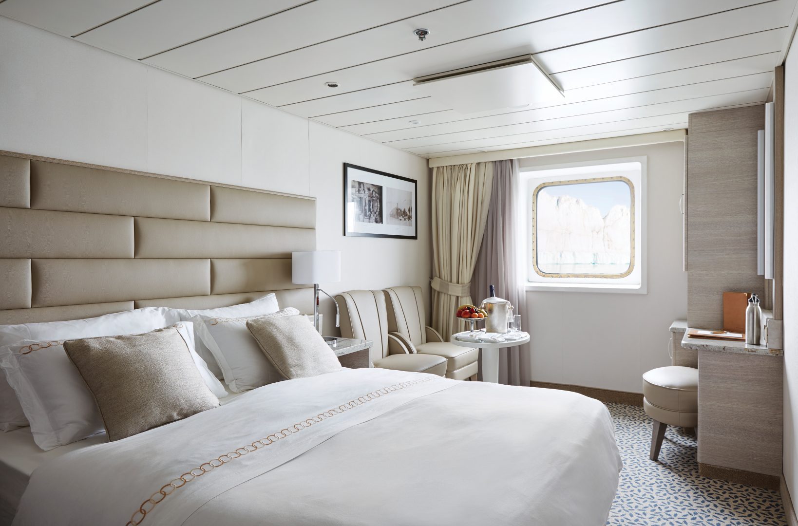View Suite – Welcoming and comfortable, the View Suite provides a relaxing haven for even the utmost adventure-seeking guests. Complete a day spent exploring onshore with an evening unwinding in the comfort of your sitting area. Capture passing ocean scenes through your view window. Freshen up in your beautiful marbled bathroom before enjoying an elegant onboard dinner. Or cozy up under fine bed linens to watch an on-demand movie on the flat-screen television. Fall asleep easily, dreaming of the incredible experiences that await you the following day. (192 sq. ft. with view window)