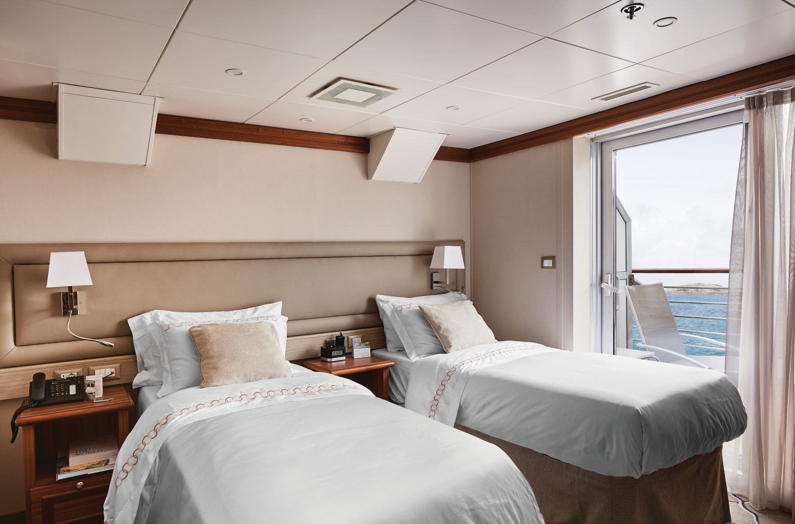 Veranda Suite – A Silversea cruise signature, complete with floor-to-ceiling glass doors that open onto a private balcony. (216 sq. ft. including a French balcony)