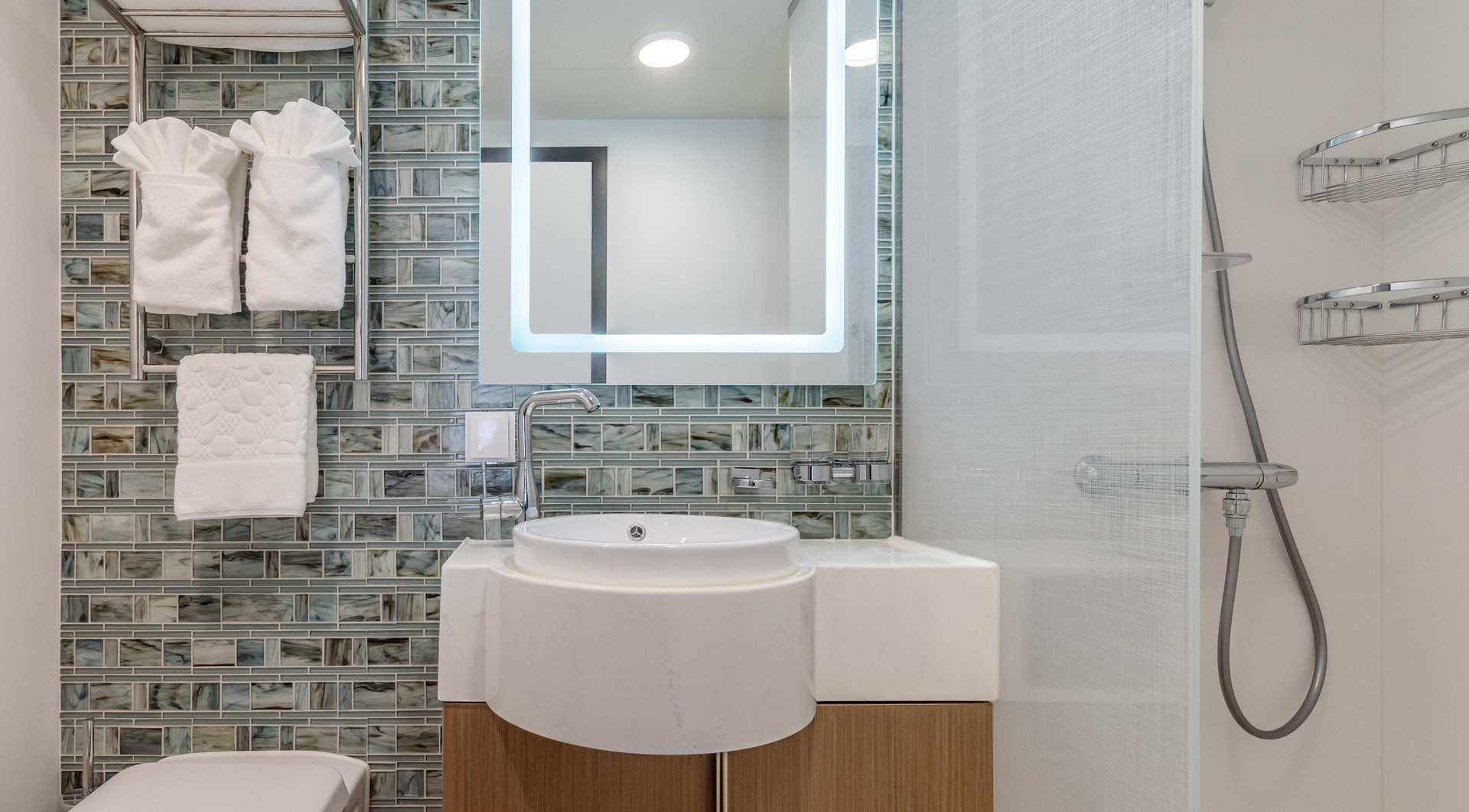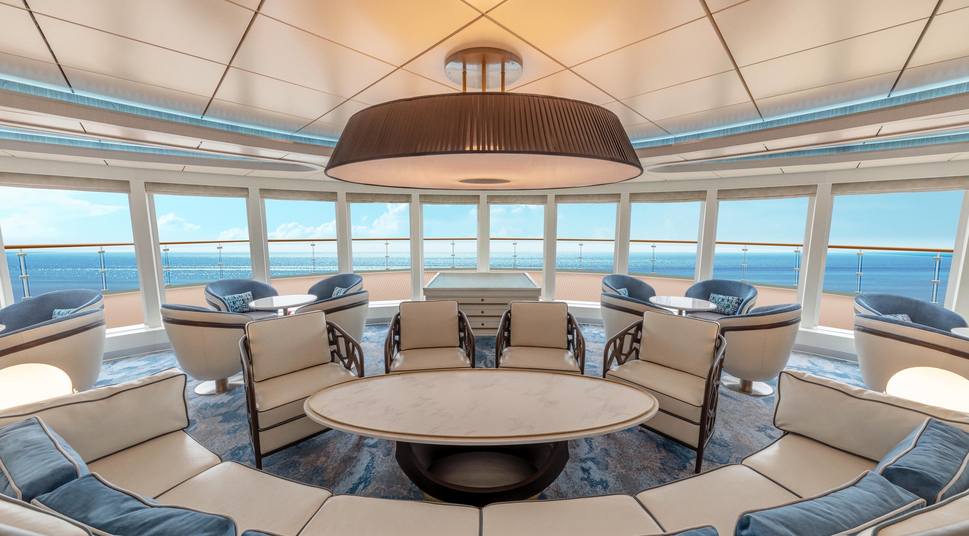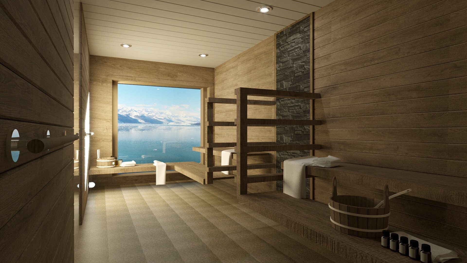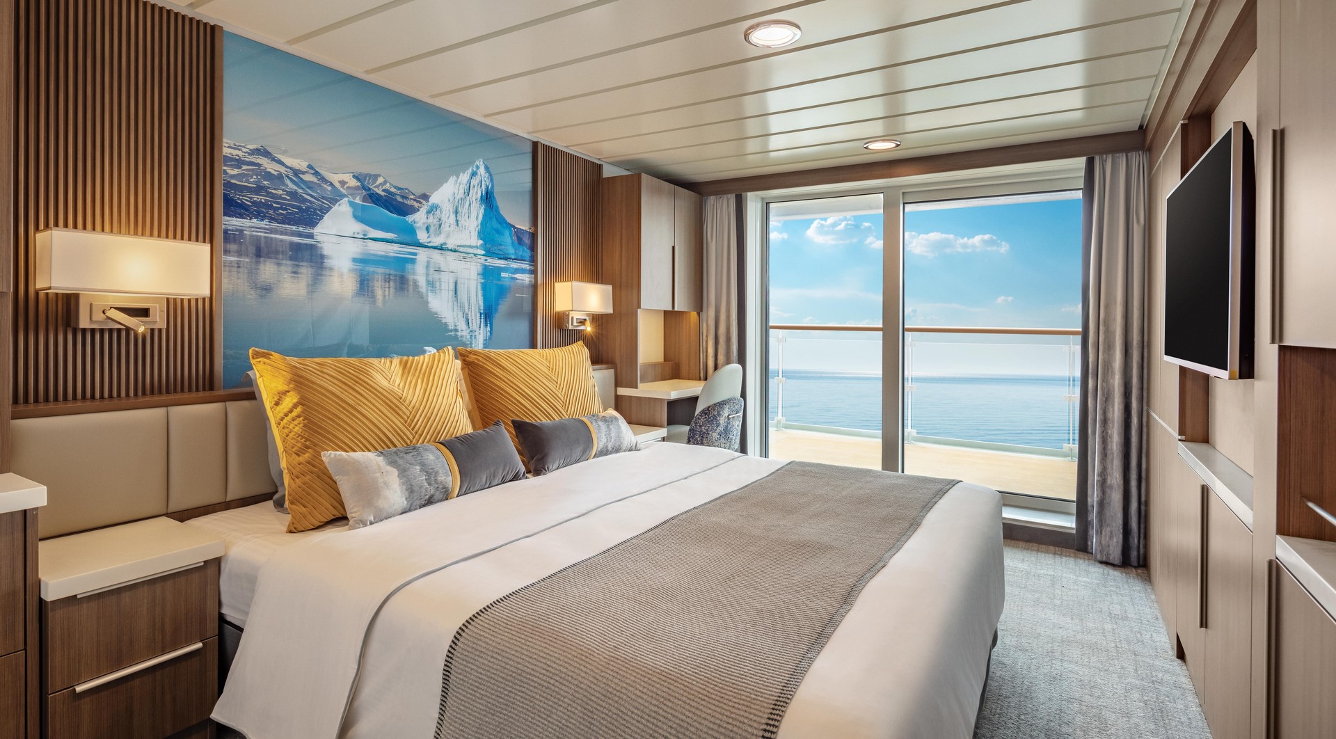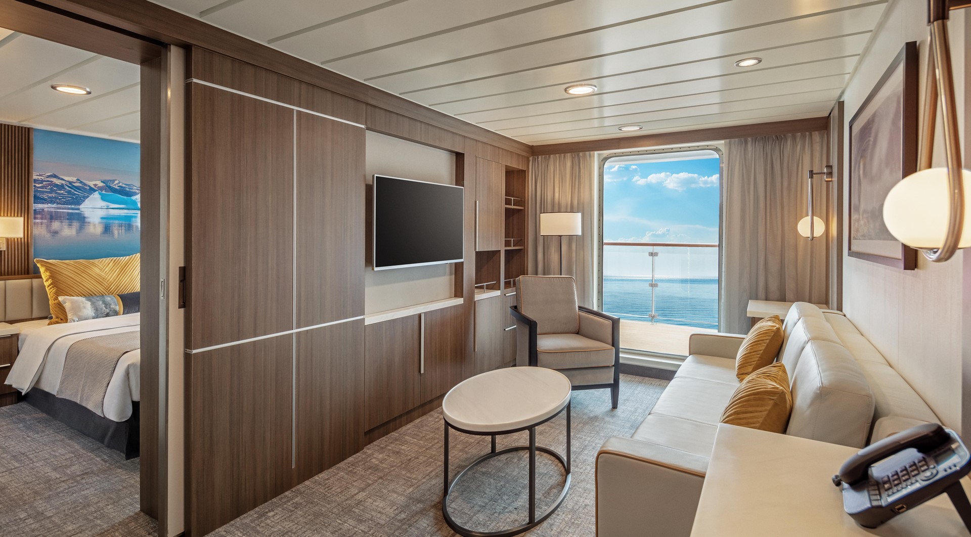 Junior Suite – The four Junior Suites take in some impressive scenery from their vantage points on Deck 7. When you aren’t enjoying a landing, you can relax in the suites’ separate lounge area, or just watch the world float by from the private balcony.