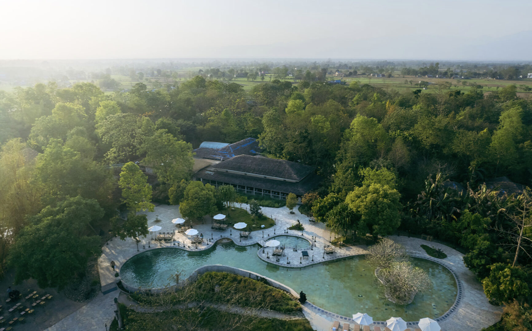 Situated on the banks of the Rapti river opposite Chitwan National Park, Barahi Jungle Lodge’s extensive 30 acres of grounds provides a truly authentic jungle experience for guests, with an array of local bird and wildlife often freely coming and going to the property. 28 individual huts and three double huts with interconnecting rooms are available, and all boast locally sourced materials, WIFi, air-conditioning, and views into the jungle. Guests can enjoy evening sundowners overlooking the river, nightly cultural dances, "bush" dinners by lantern-light (upon request), massages in the onsite spa, a sprawling stone-paved swimming pool, a library, and cozy bar and lounge spaces.