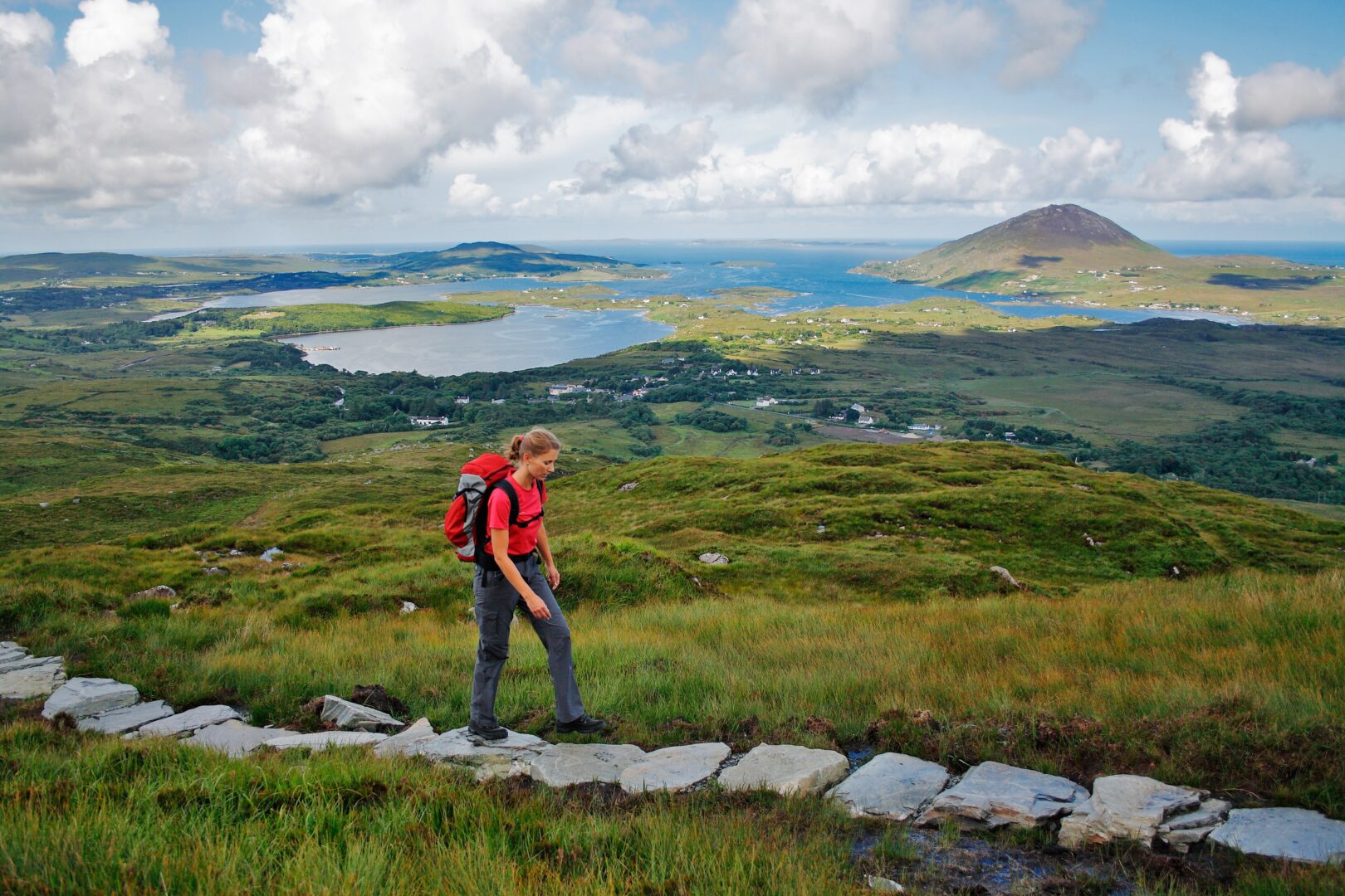This morning your private driver-guide will meet you at Ballynahinch to begin your first day of hiking. Set out on the captivating 7-kilometer trail in Connemara National Park, ascending the narrow path to the summit of Diamond Hill, the region’s most iconic peak. From the top, sweeping views stretch across the rugged mountains on one side and the sparkling Atlantic on the other.