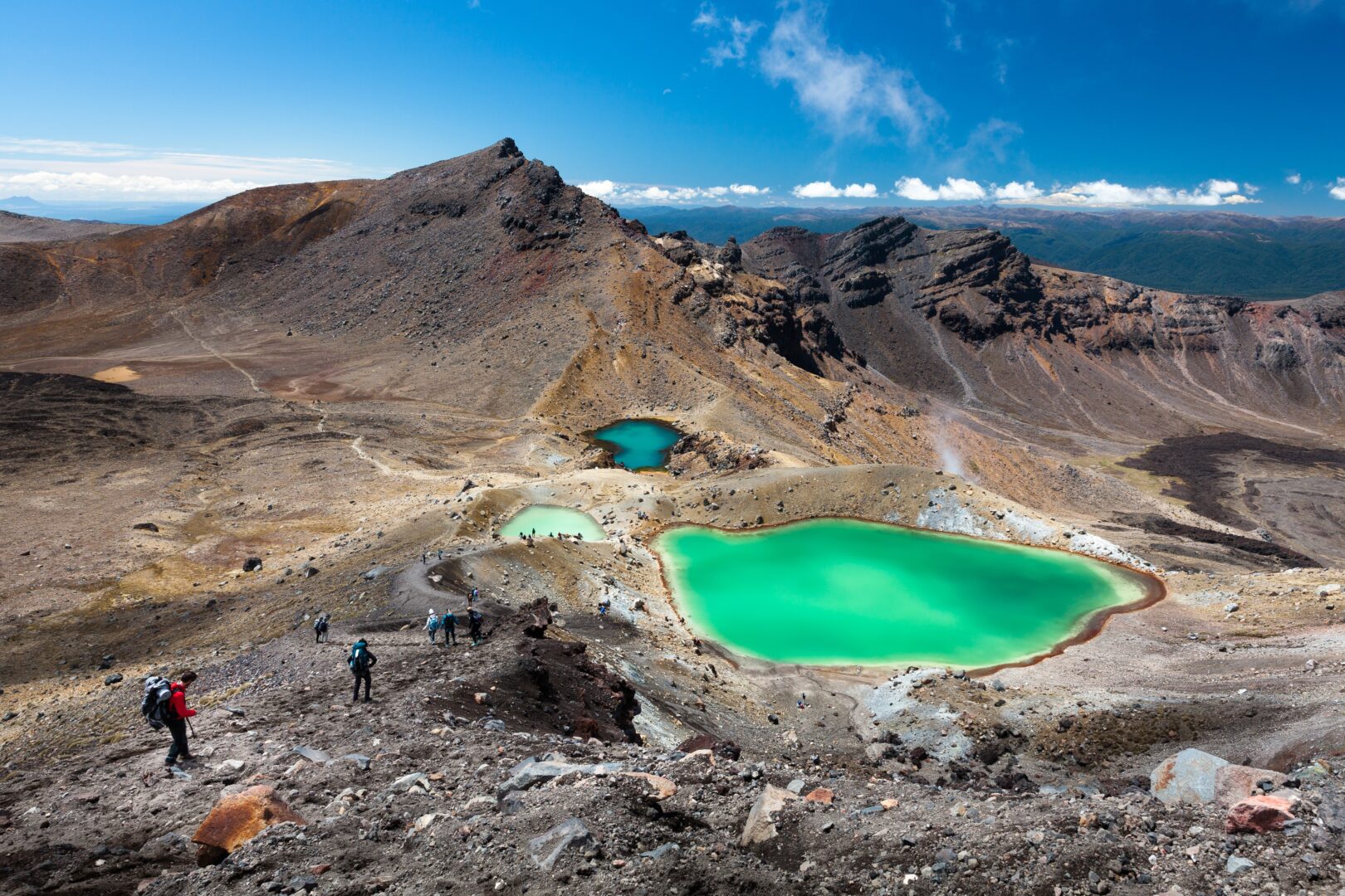 Hike past active craters, ancient lava flows, volcanic steam vents, and technicolored emerald lakes, all with views of Mount Tongariro and the towering Mount Ngauruhoe in the backdrop. The hike takes approximately seven hours on the trail, with an additional two to three hours for return travel from Taupō. Though challenging, the trail rewards hikers with some of the most spectacular volcanic scenery in the southern hemisphere. It demands good physical fitness, surefootedness, and a sense of adventure!