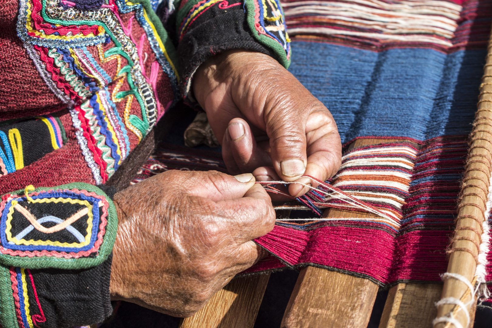 Visit Chinchero, a traditional small town situated on a plateau overlooking the Sacred Valley. Explore a colonial church with remarkable paintings and frescoes, which was constructed over the ruins of an Incan temple and is surrounded by impressive Incan terracing. Chinchero is also home to several highly-regarded weaving cooperatives known for the quality of their textiles. Peru is known for its intricate traditional weavings, many of which use symbols to tell stories or depictions of daily life.