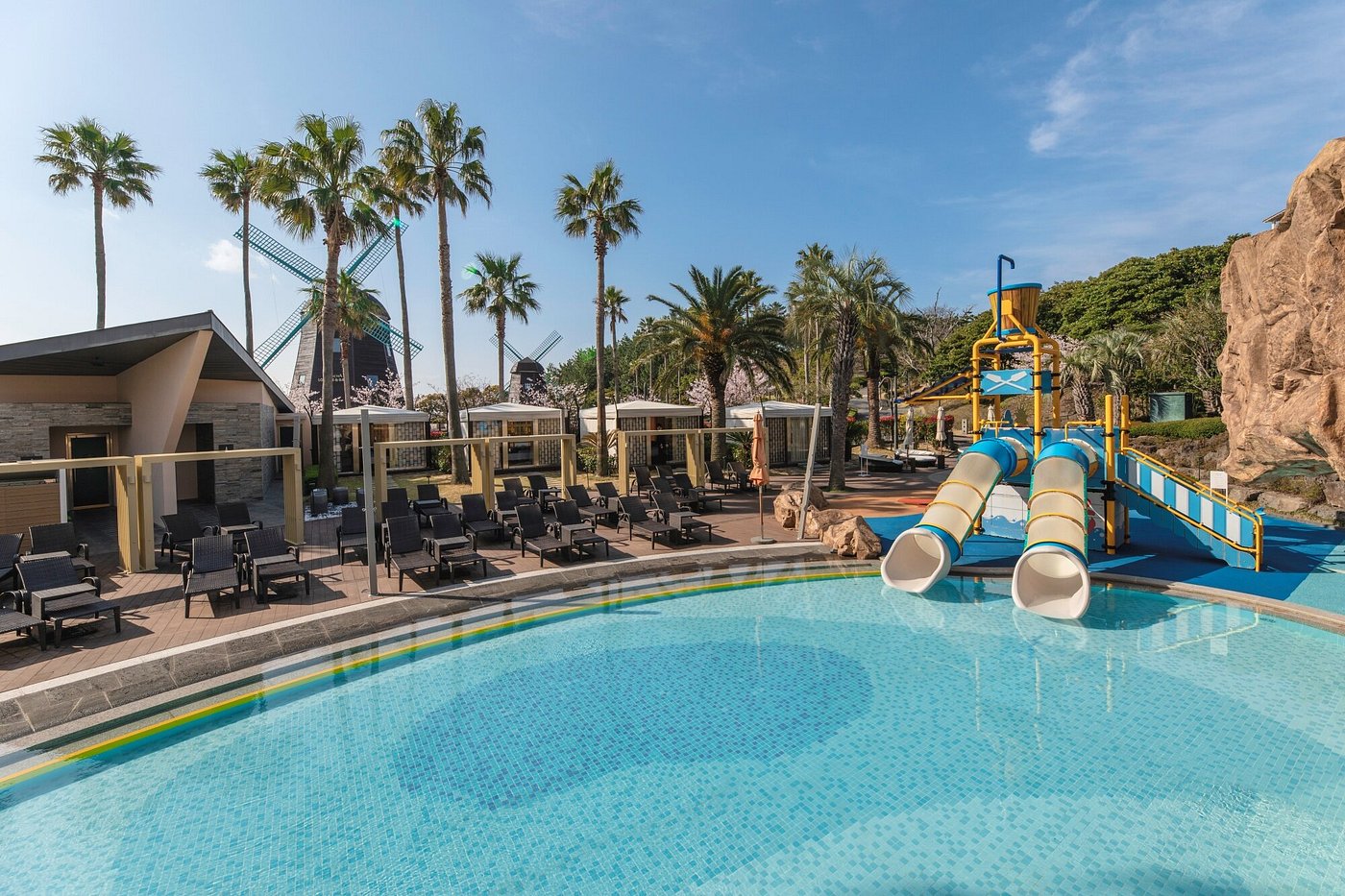 Lotte Hotel Jeju is a large resort-style property located on the southern coast of Jeju Island, offering expansive ocean views and extensive leisure facilities. The hotel features a wide range of rooms and suites, many with balconies overlooking the sea or gardens. Facilities include multiple restaurants serving Korean and international cuisine, a heated outdoor pool with waterfalls and a private beach area, a luxury spa, a tennis court, and landscaped walking paths.