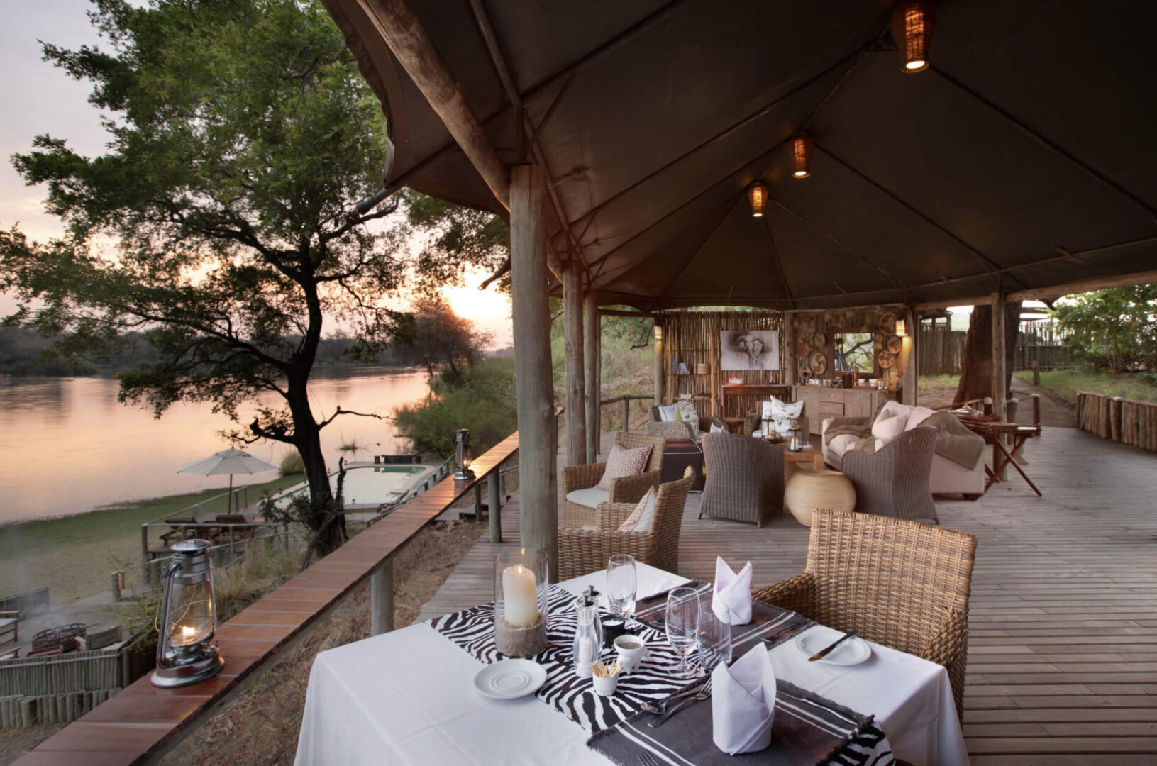 Elevated on a riverbank, overlooking the expansive Zambezi River in perpetual motion is Amanzi luxury safari camp, an intimate and enthralling Zambian establishment. The luxury safari lodge is carved into the landscape, with the persistent flow of the river a mesmerizing focal point. Here, wildlife is left to roam freely across the floodplains; elephants silhouetted against the shimmering sun pass regularly pass by, ignoring the grunts of hippo and shouts of the bird life as it meanders across the landscape.